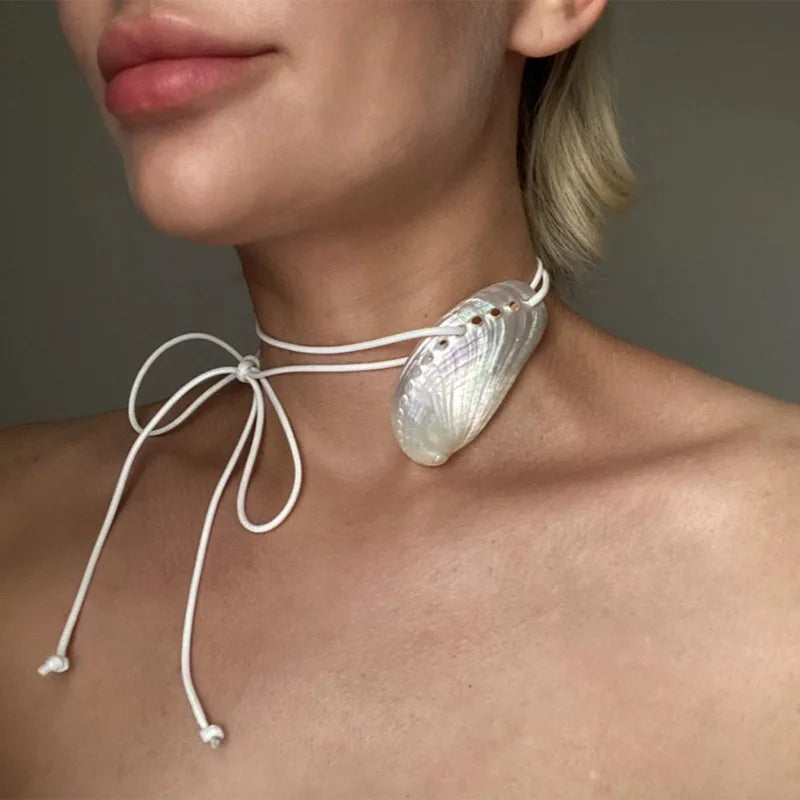 A single hand‑polished sea‑shell, cut to reveal nacre that shifts from champagne to aqua, anchors a whisper‑thin wrap cord that knots high on the collarbone. The feather‑light profile captures every glint of sunset, turning even a simple tee into a Riviera moment.