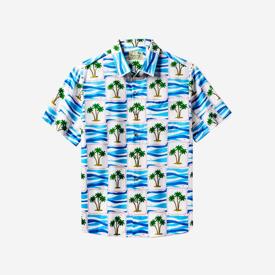 Imagine a vibrant oasis of stylized palm trees swaying against a backdrop of cool blue stripes. Crafted from a lightweight, breathable fabric, this shirt is your go-to for sunny days and good times.