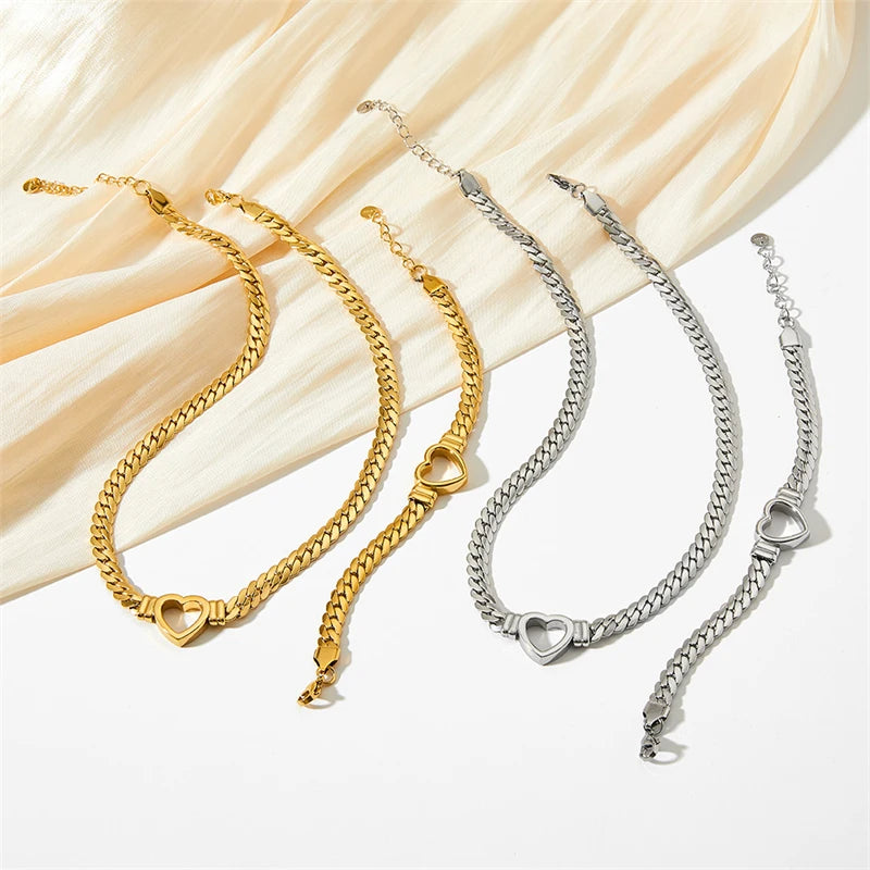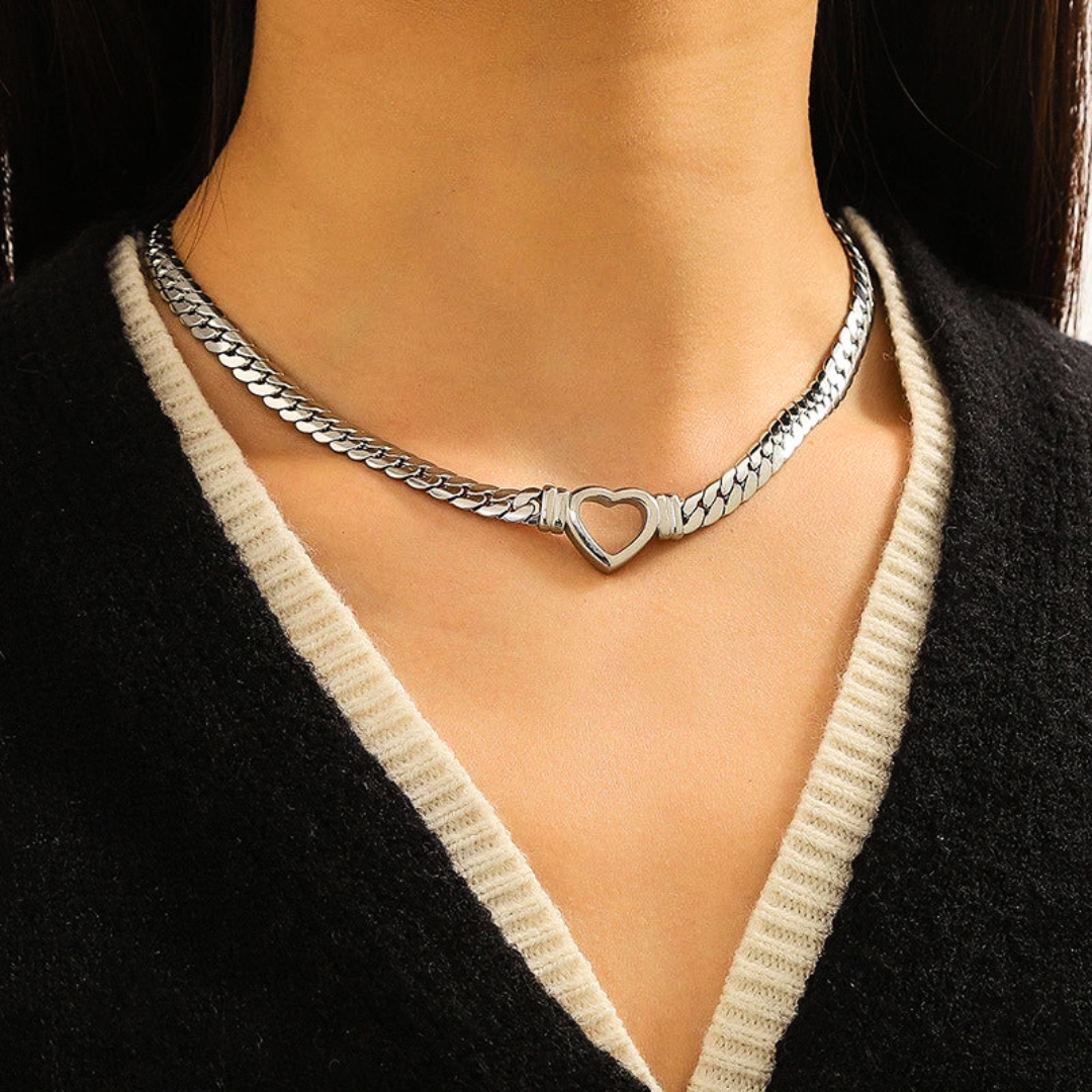 The centerpiece of each ensemble is a gracefully sculpted heart, a timeless symbol of love reimagined for the modern woman. It seamlessly integrates into a robust chain, striking a perfect balance between delicate artistry and a bold statement.