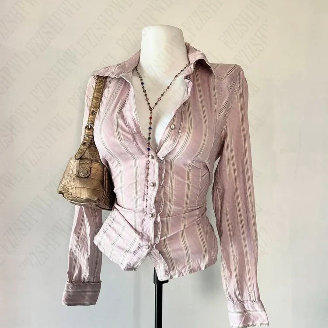 Rose‑dust stripes trace a body‑skimming silhouette with corset‑seam tailoring, pearlized buttons, and lace‑tipped cuffs—think 2004 party girl meets Paris showroom.