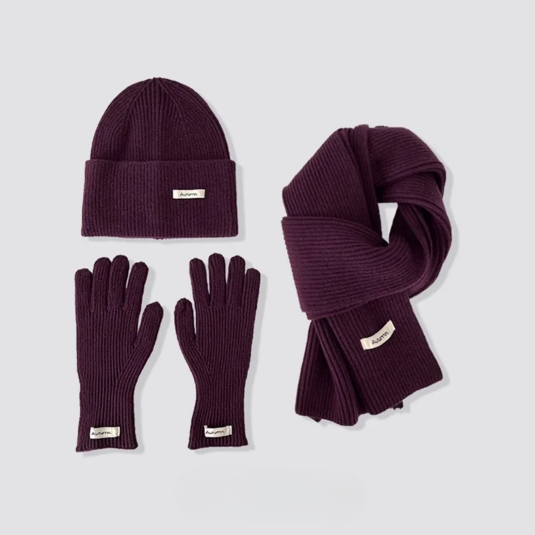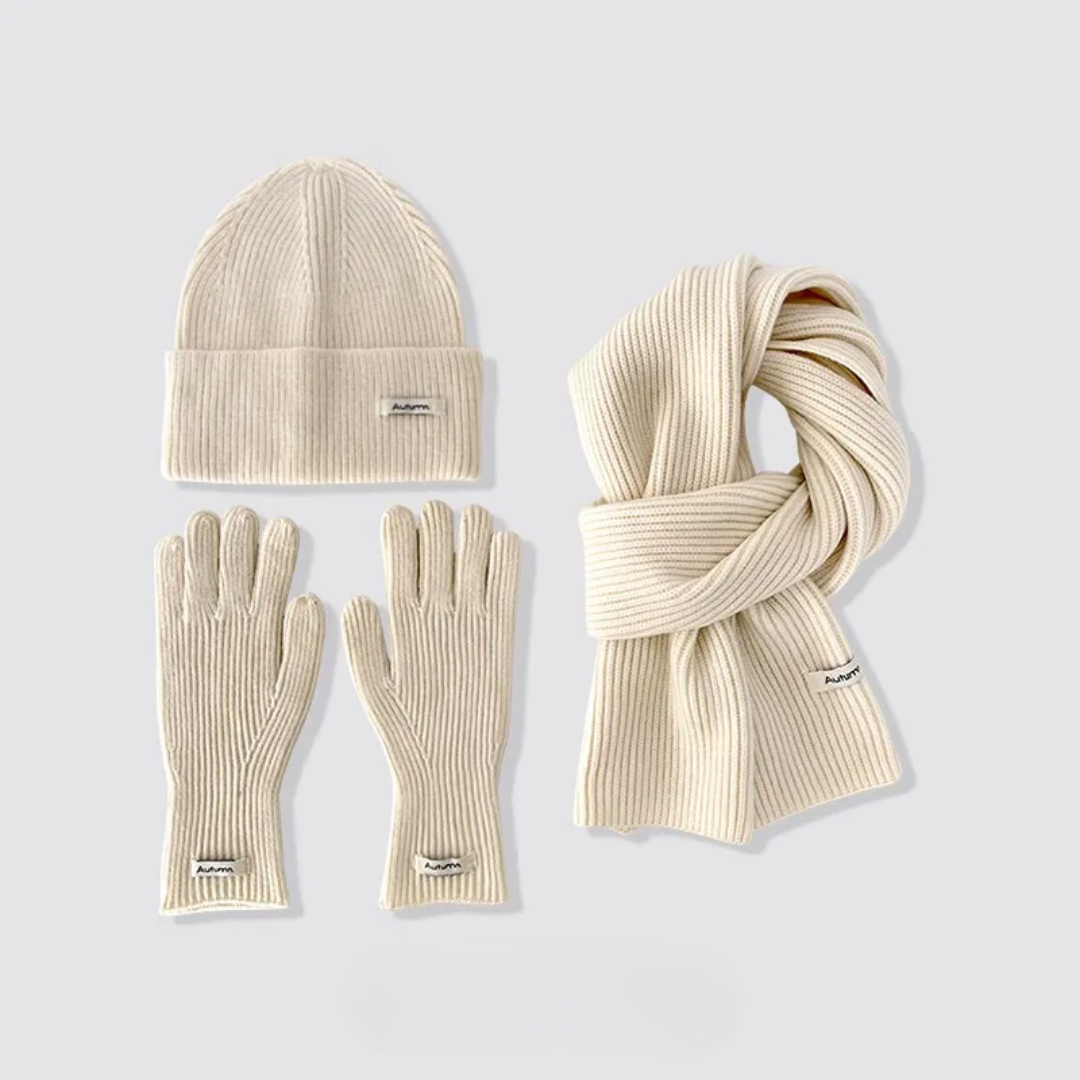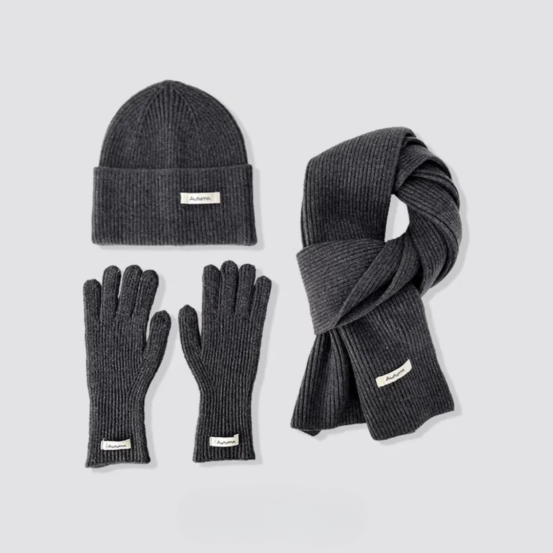 - Three‑piece set: beanie, long scarf, tailored gloves