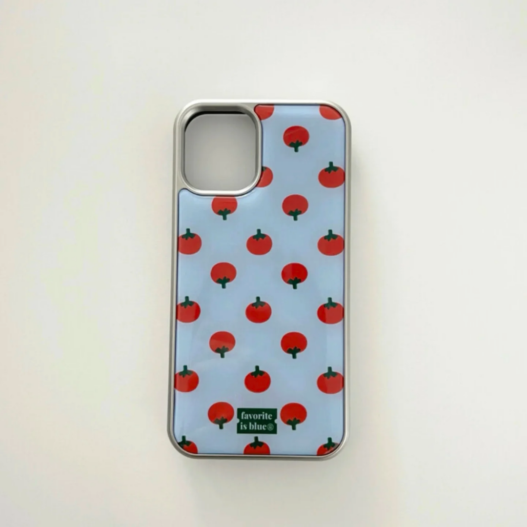 Tiny red tomatoes dot a sky‑blue ground on a slim, edge‑wrapping cover that slips easily into pockets. The flexible shell keeps a clean profile while raised bezels help guard the screen and camera; print placement may vary by device size.