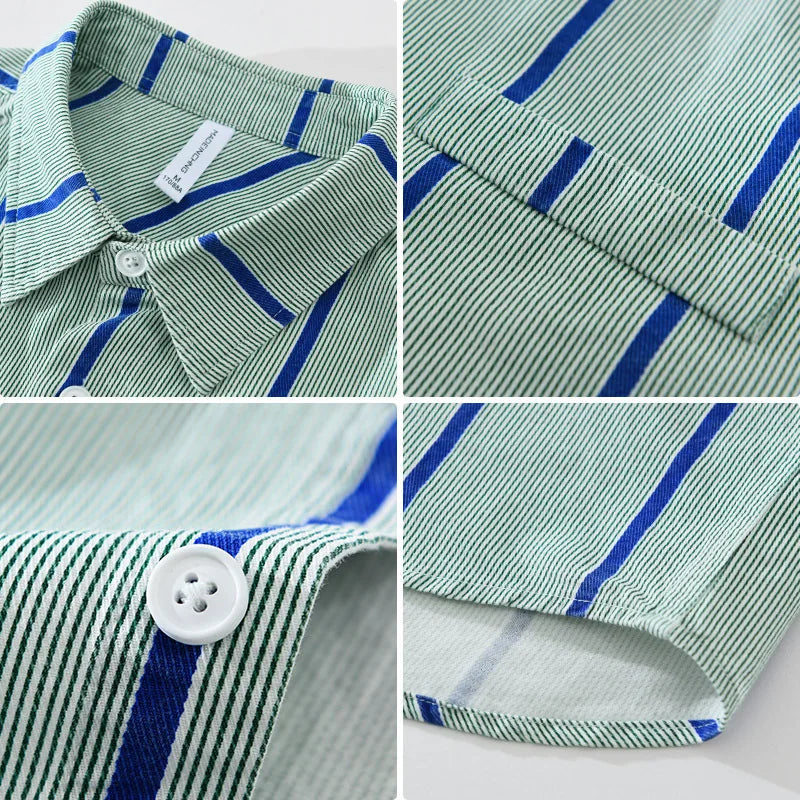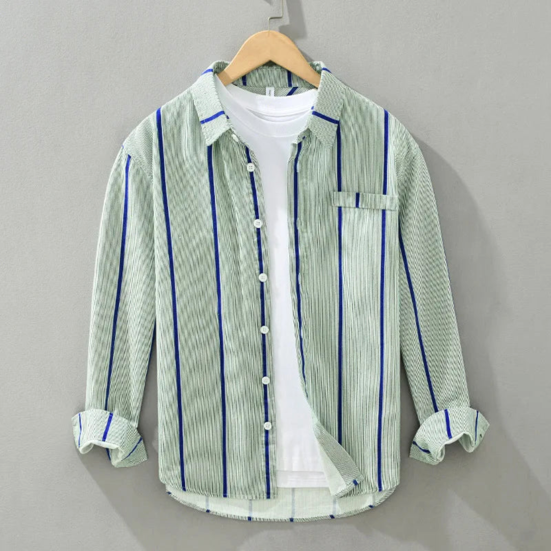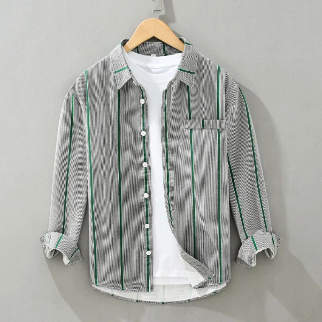 The rich green and gray fabric, highlighted by fine vertical stripes and bold accents, exudes formality. Whether you're dressing for a casual outing or a more formal event, the Coventry Pinstripe Classic Shirt ensures you always look your best.
