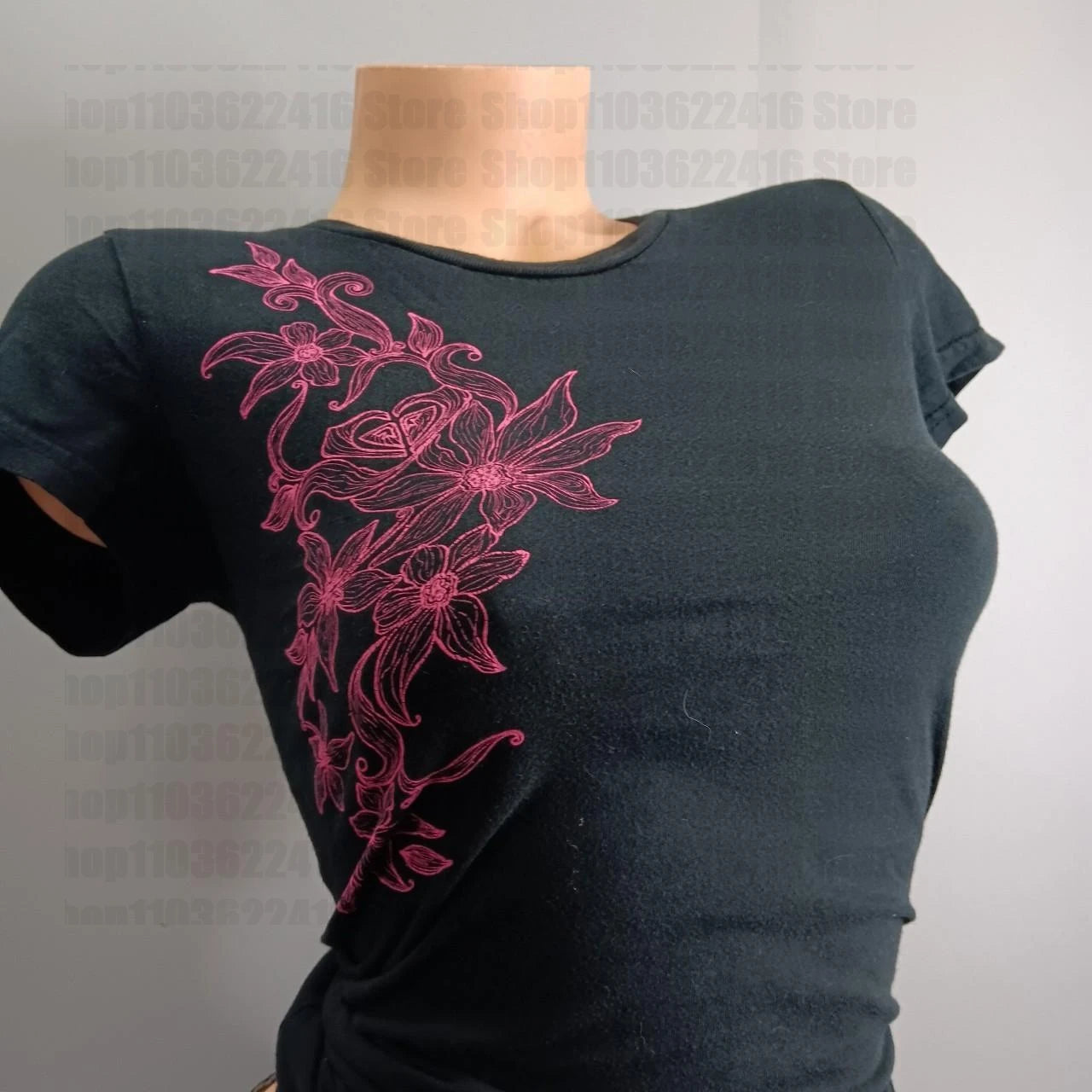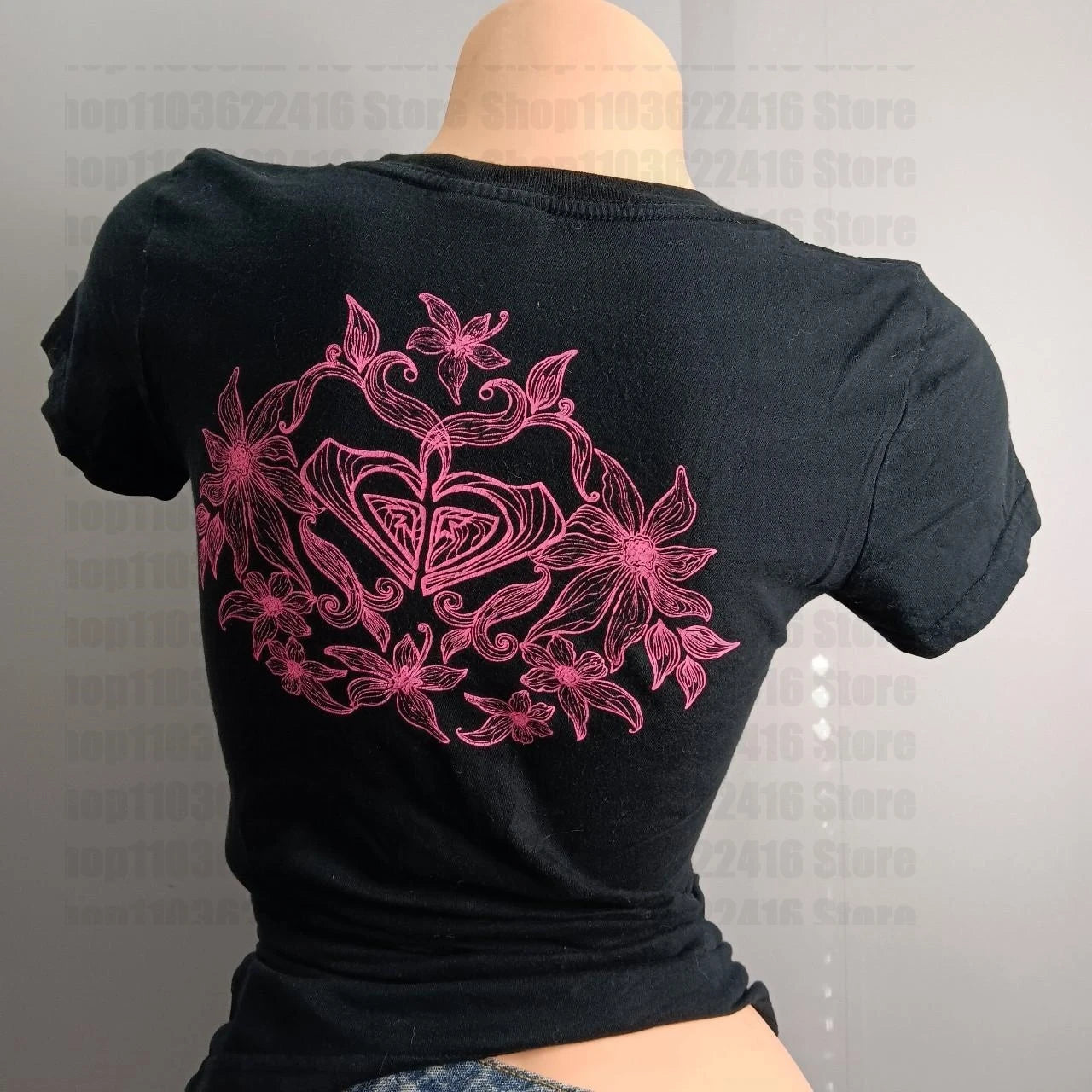 Capture that edgy 2000s vibe with a bold pink flower graphic on sleek black. Its slim, retro-inspired silhouette nods to vintage Harajuku style, perfect for turning heads at concerts or casual hangouts.