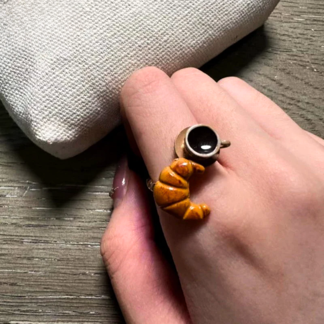 This adorable duo features a golden croissant ring and a miniature coffee cup ring, both adjustable to fit any finger. Perfect for adding a touch of whimsy and personality to your everyday style.