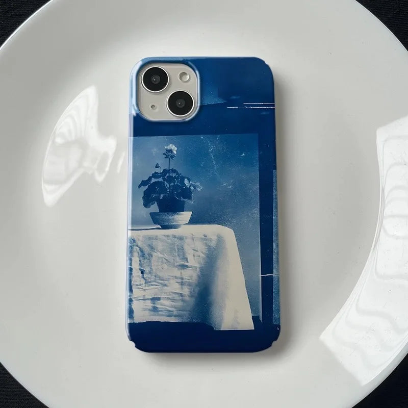 A museum-blue statement piece. The cover features a cyanotype‑style still life—vase, linen, and shadow—printed in deep indigo with a high‑gloss lacquer that catches light like glass, while a slim protective shell keeps your phone clean-lined and camera safe.