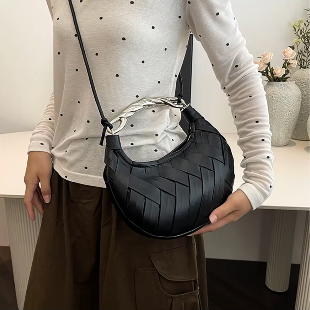 Fall in love with the handcrafted woven details of this Dalia Crescent Bag—which features a unique crescent shape. Its buttery-soft faux leather feels luxurious against your skin, while the sleek chain strap completes the bag – perfect for day or night.