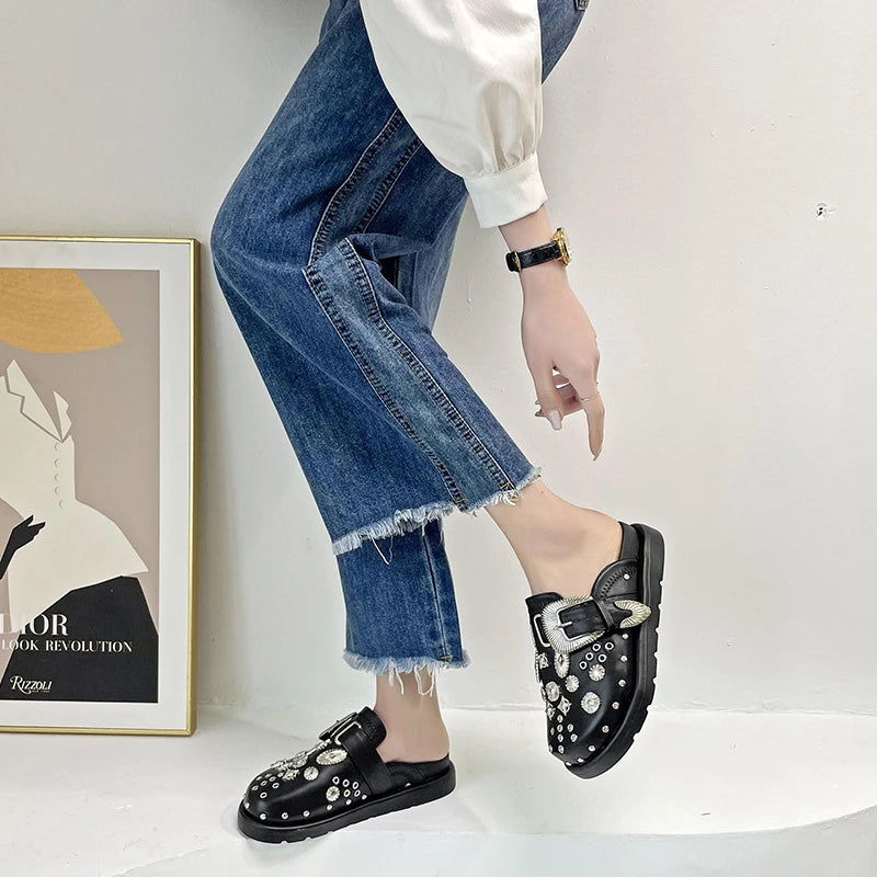 With a constellation of sparkling studs and a statement buckle, these slides will transform every sidewalk into a runway, every night out into a celebration. So slide into the spotlight, channel your inner diva, and let your feet do the talking.