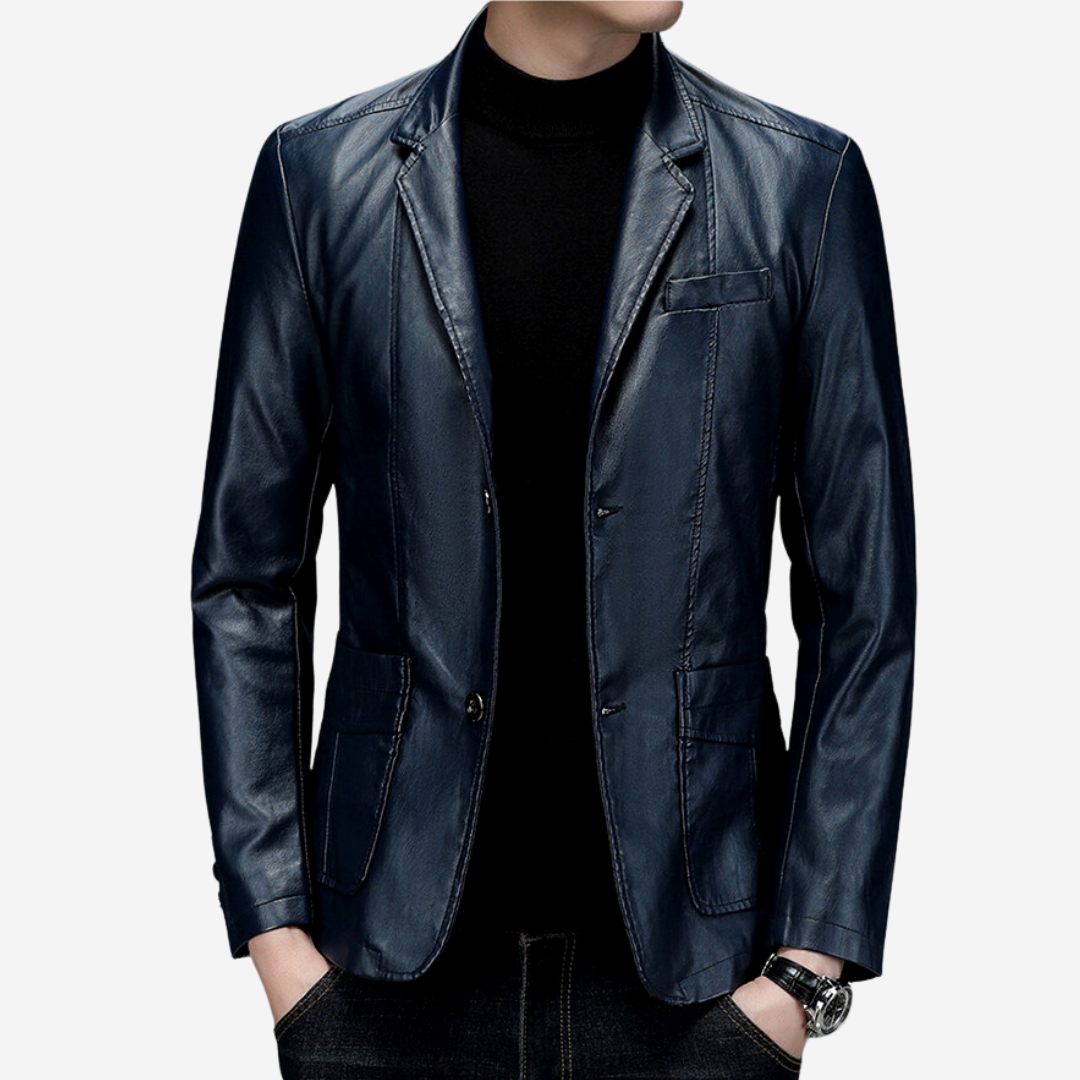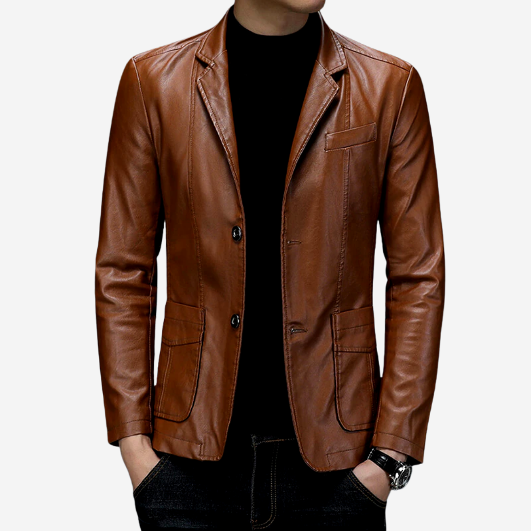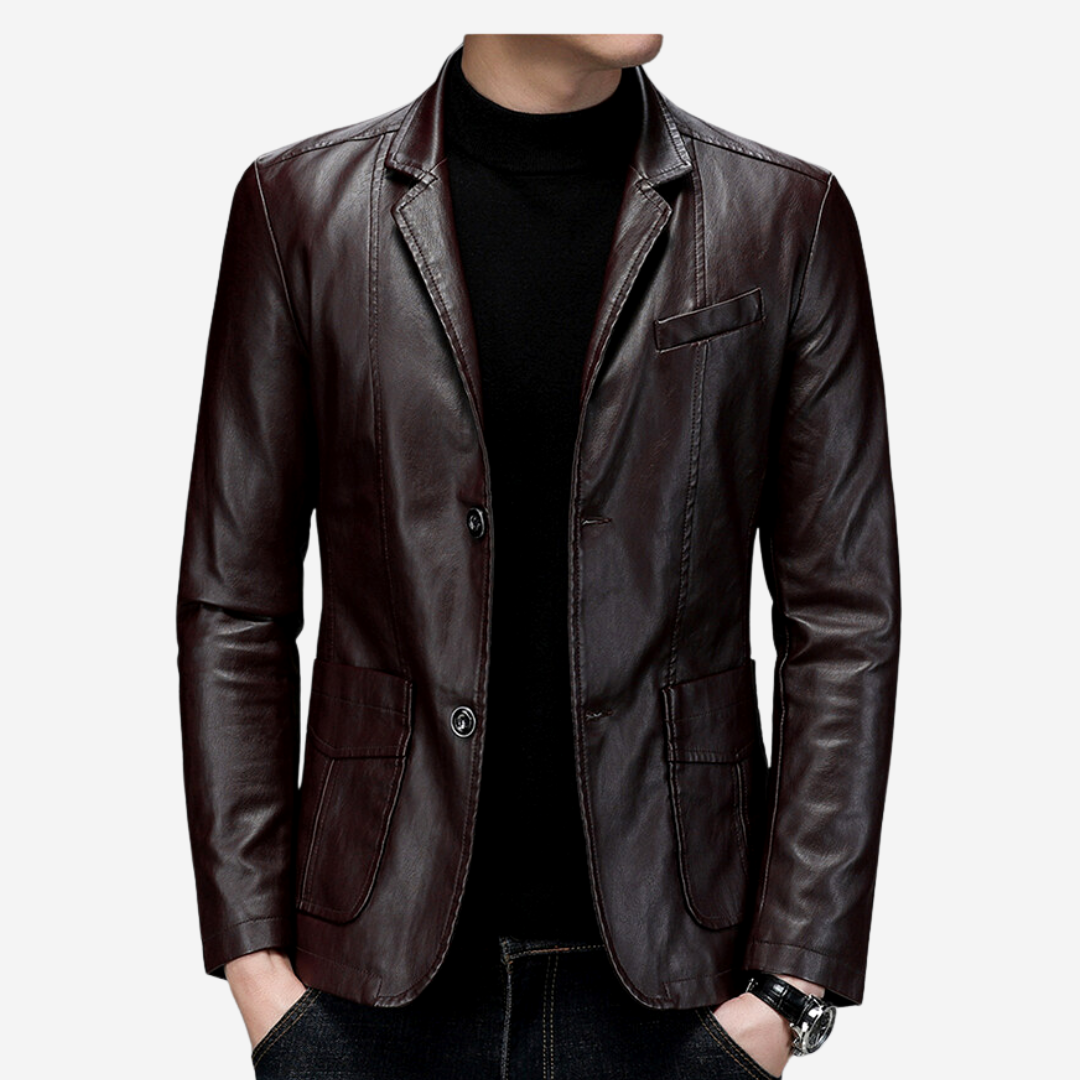 Make a statement in the Tom Adams Leather Blazer. This classic two-button blazer is crafted from high-quality PU leather and features a collared neckline, two side pockets, and a left chest pocket. Its sleek and modern design gives you a polished, sophisticated look.