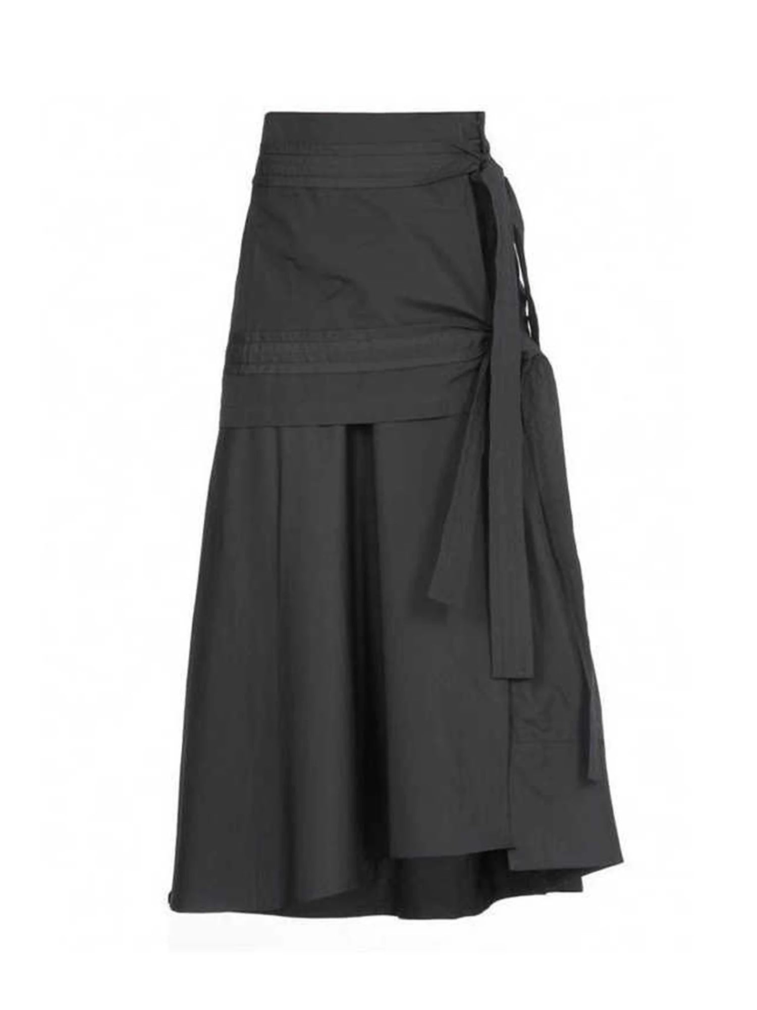 Echo Vale reworks utilitarian tailoring with sculptural layers. Cut from structured woven fabric in charcoal, this A‑line midi wraps at the hip and cinches with a side lace‑up tie, creating soft volume and an irregular, modern hem.