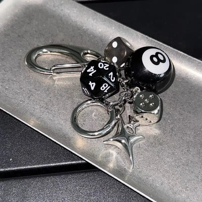 This edgy keychain showcases black dice, an eight-ball charm, and a sleek star pendant for a bold, Y2K-inspired look. Crafted with durable metal links and a secure clasp, it offers a touch of punk flair that elevates any bag or set of keys.