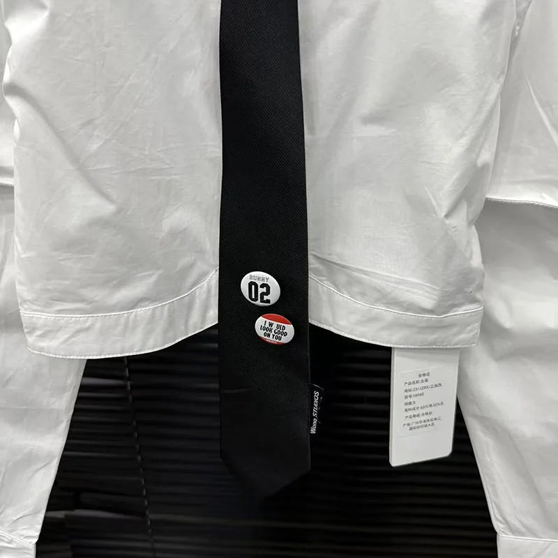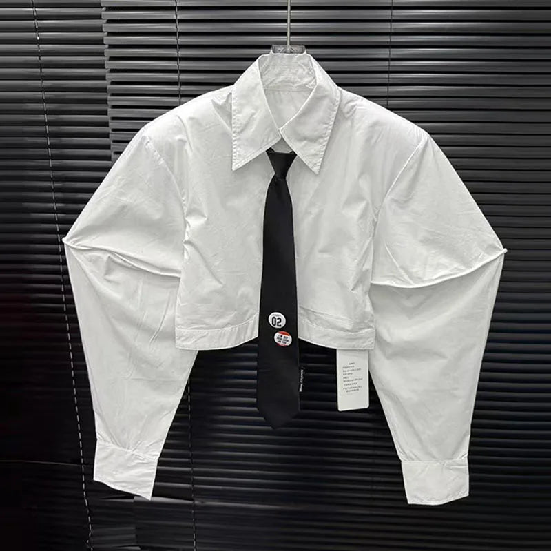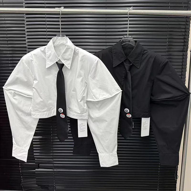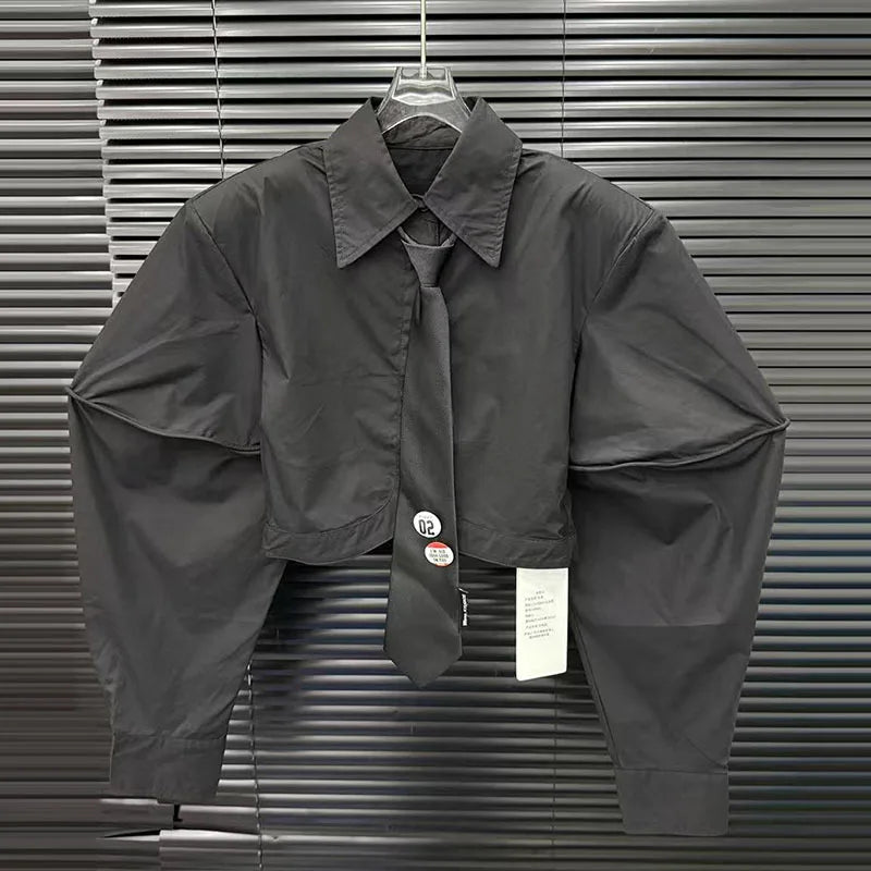 Cut from crisp woven fabric, it frames the shoulders with a point collar and long sleeves, finishing with a slim tie that adds uniform‑meets‑runway attitude over tanks or minis.