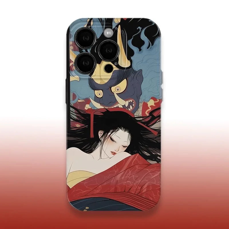 Edo Reverie layers a moonlit Oni mask over a resting geisha, rendered in rich indigo, vermilion, and gold accents inspired by ukiyo‑e prints. The artwork wraps edge‑to‑edge with a smooth, satin finish while a clean, slim profile and raised camera ring keep the silhouette sleek and the lens guarded.
