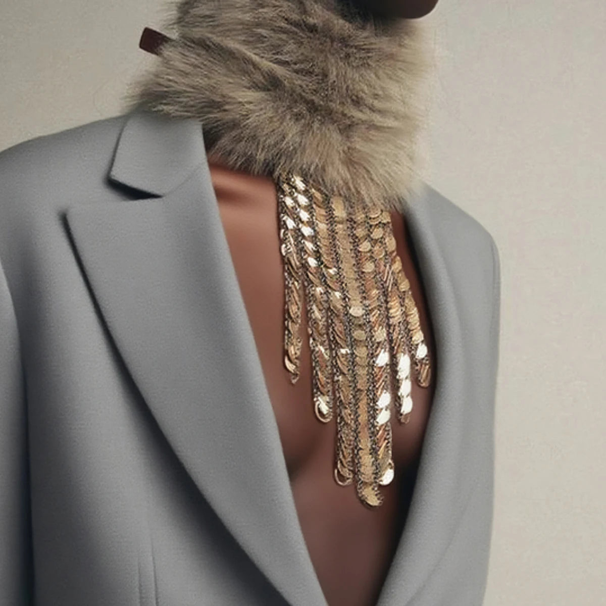 Rows of shimmering round metal sequins spill in a waterfall from the collarbone, catching every flicker of light like stagewear. The fluid drape sits beautifully over knits, blazers, and bare skin for an instant gala glow.