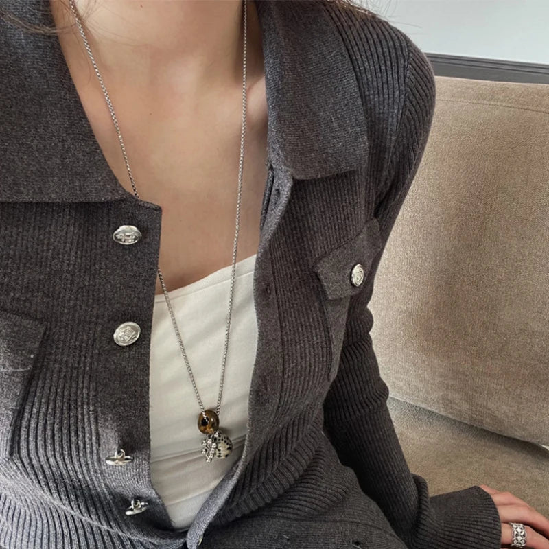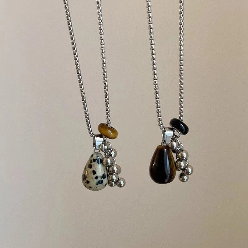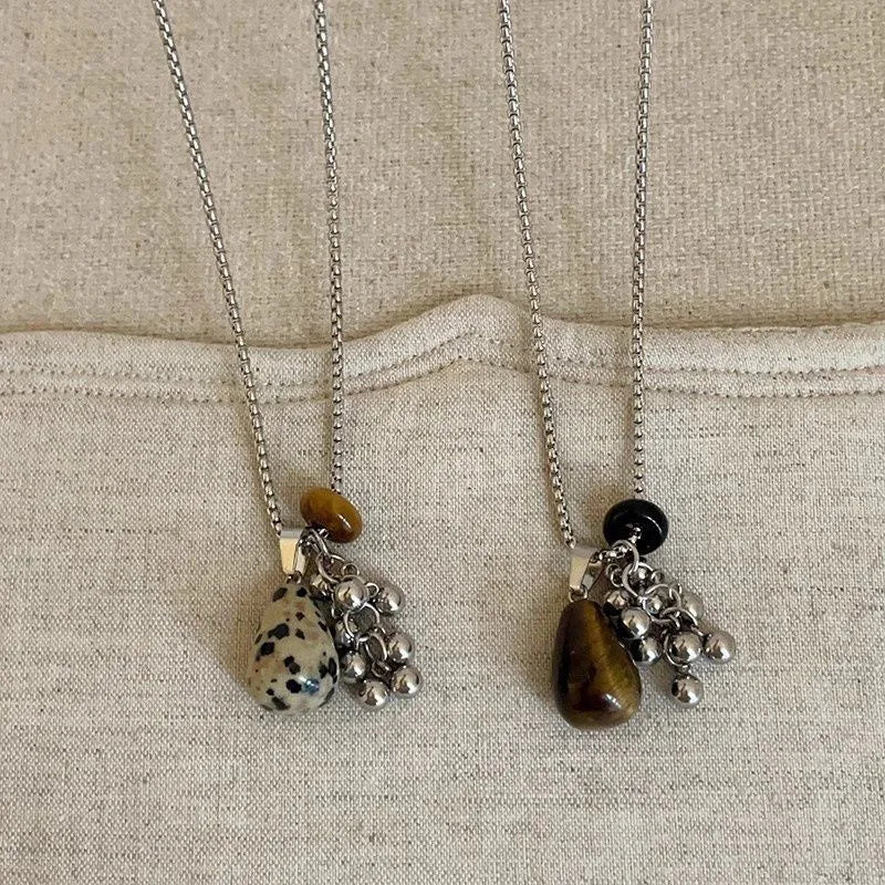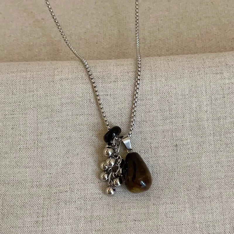 Polished tiger‑eye drops and a speckled charm cluster swing from a slim cable chain, flashing warm gold‑brown bands as you move. The mixed stones and sculpted metal give easy, gallery‑shop character you can dress up or down.