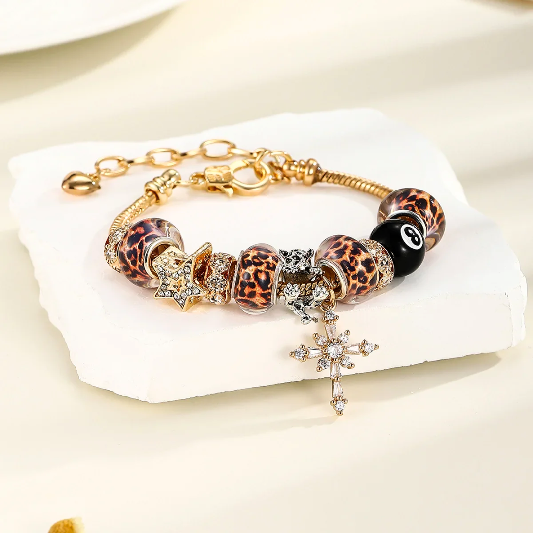 Night-Prowl strings leopard-print glass beads, crystal spacers and a zircon cross charm along a gold-toned snake chain, giving the bracelet a mix of wild and delicate energy. The adjustable lobster clasp and bead extender let you fine-tune the fit so it sits just right on the wrist.