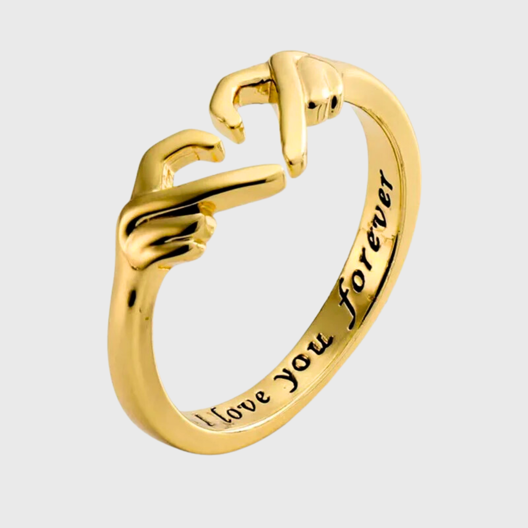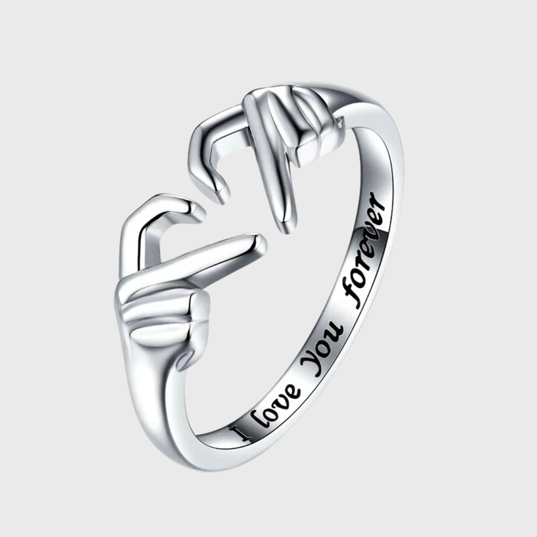This exquisite piece showcases two interlocking hands, symbolizing an unbreakable bond that stands the test of time. Masterfully crafted in your choice of lustrous silver or warm gold, each ring bears a heartfelt engraving that reads "Love you forever."