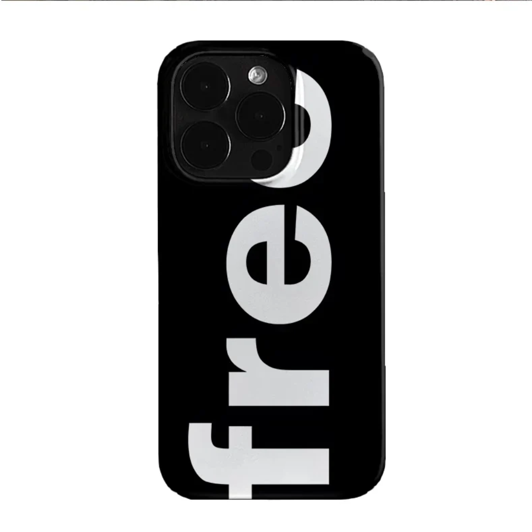 Crisp, oversized lettering commands attention, while a smooth, jet-black shell whispers refined minimalism. Engineered for resilience and a slender grip, it boldly declares your right to break free wherever you roam.