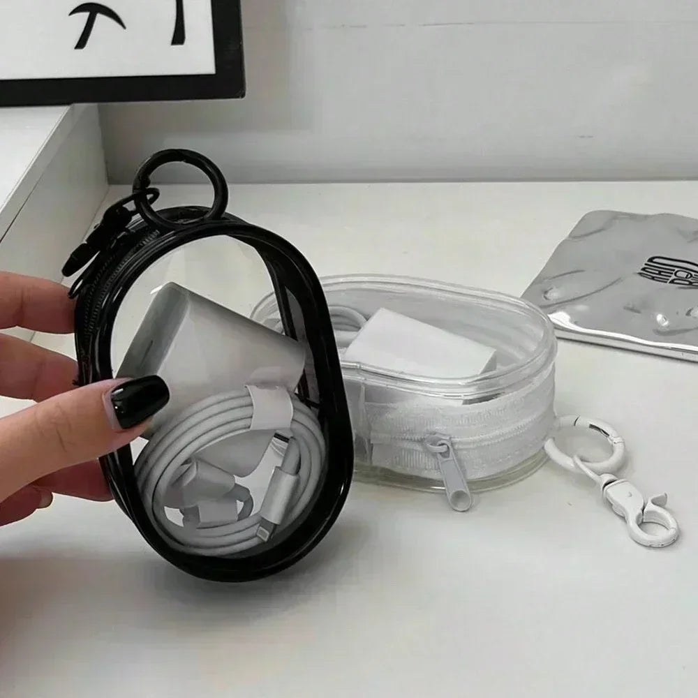 A see-through mini pouch for easy access to headphones, chargers, and small must-haves. Its keychain clip hooks securely to any bag or belt loop, perfect for travels or everyday errands.