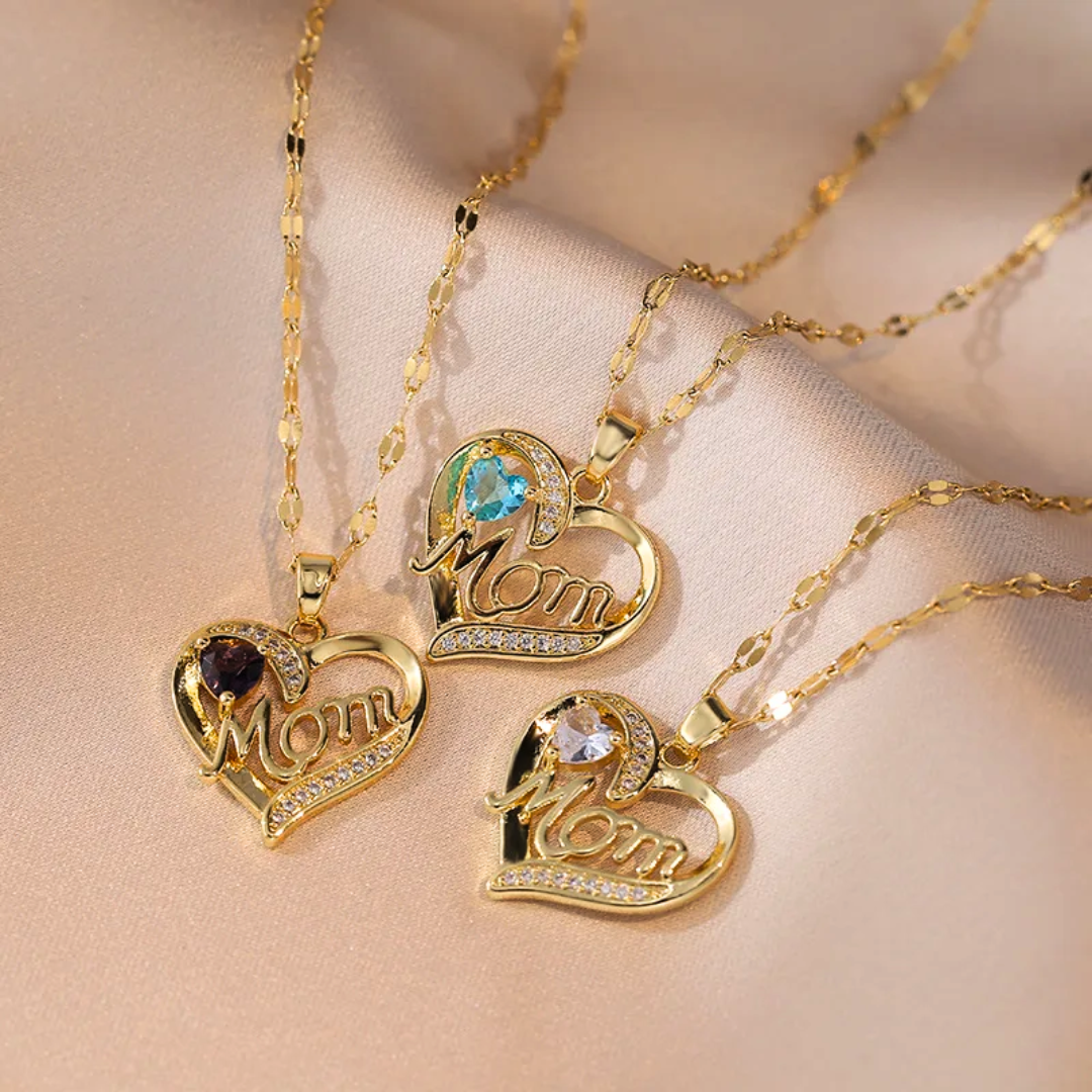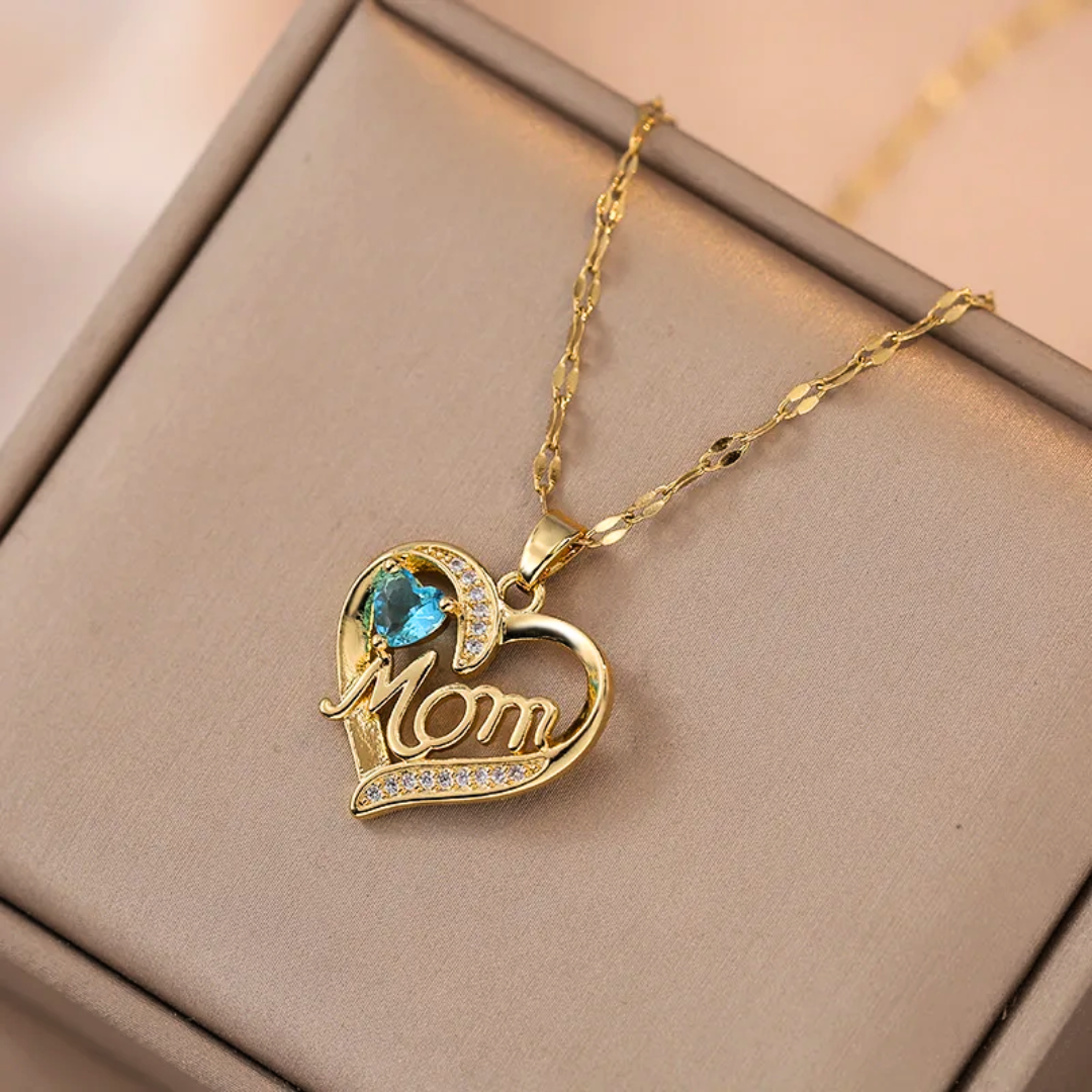 This piece is designed to be a testament to the cherished relationship with a mother. Each necklace features a delicate heart-shaped pendant, lovingly inscribed with the word "Mom" and adorned with a sparkling birthstone. It's a symbol of appreciation and an everyday reminder of the special place she holds in your heart.