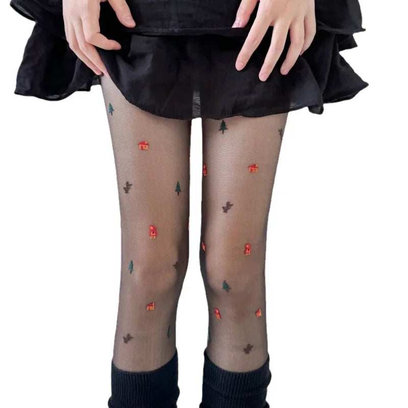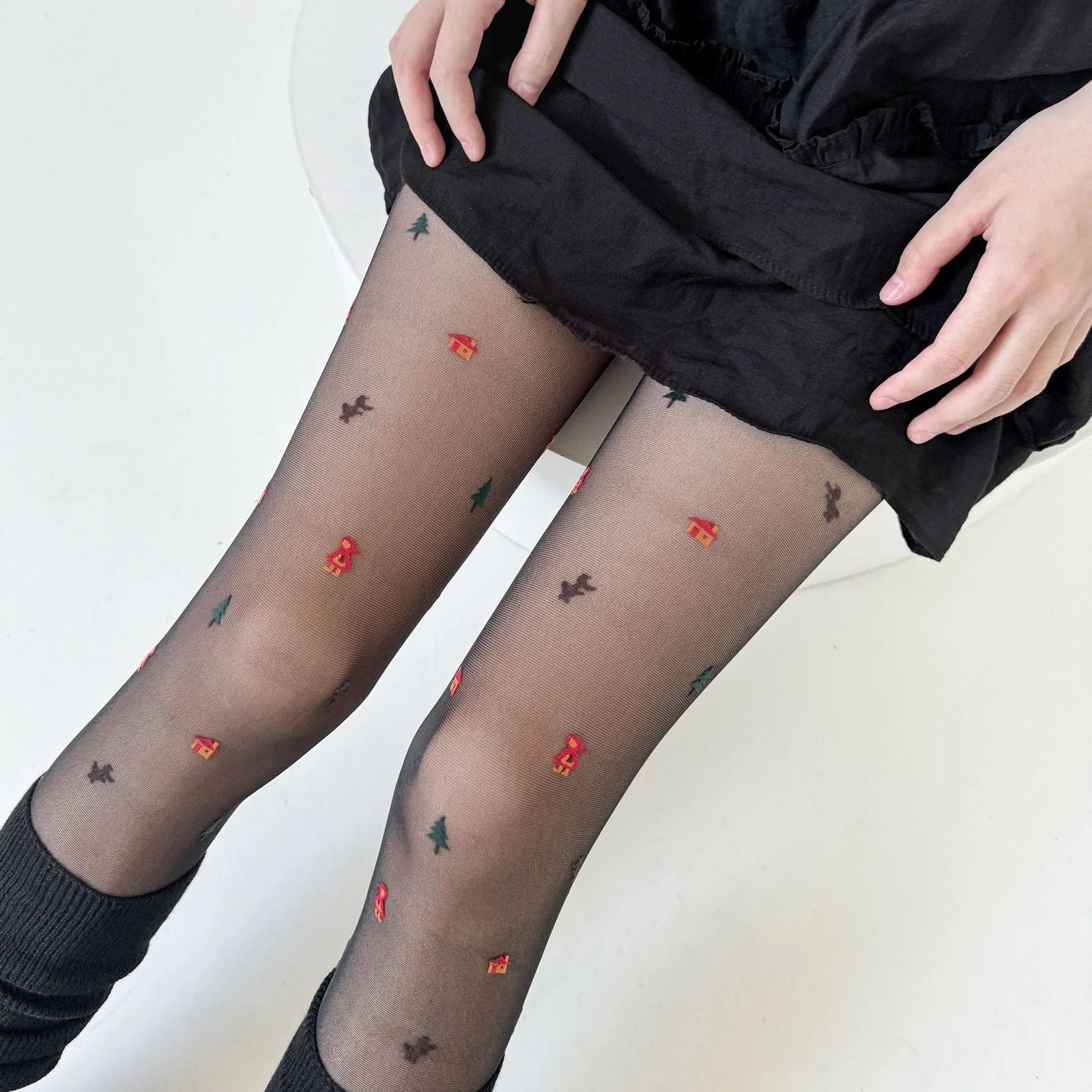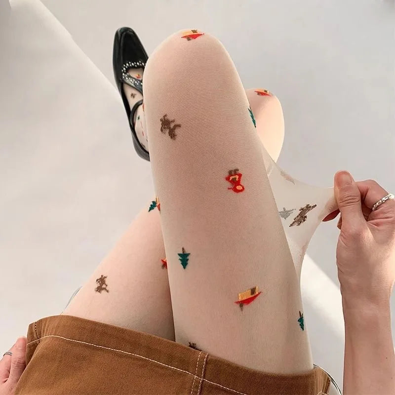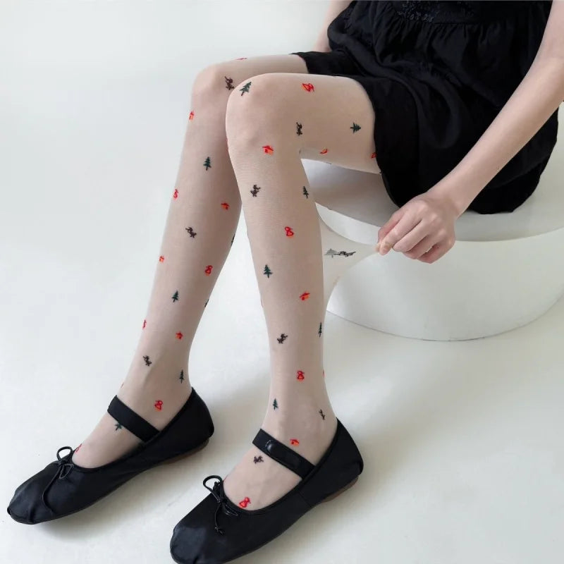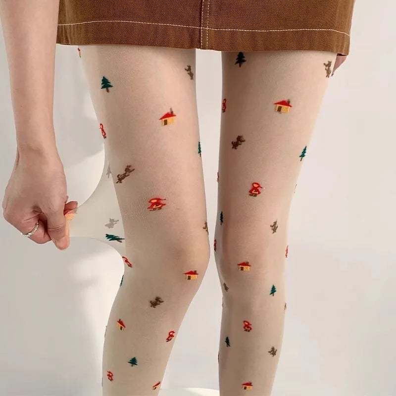 Slip into a storybook: ultra‑thin, milk‑beige tights scattered with tiny trees, cabins and ornaments woven in a fine Japanese jacquard. They smooth the leg with a soft matte finish and disappear under skirts while the whimsical micro‑motifs catch the light.
