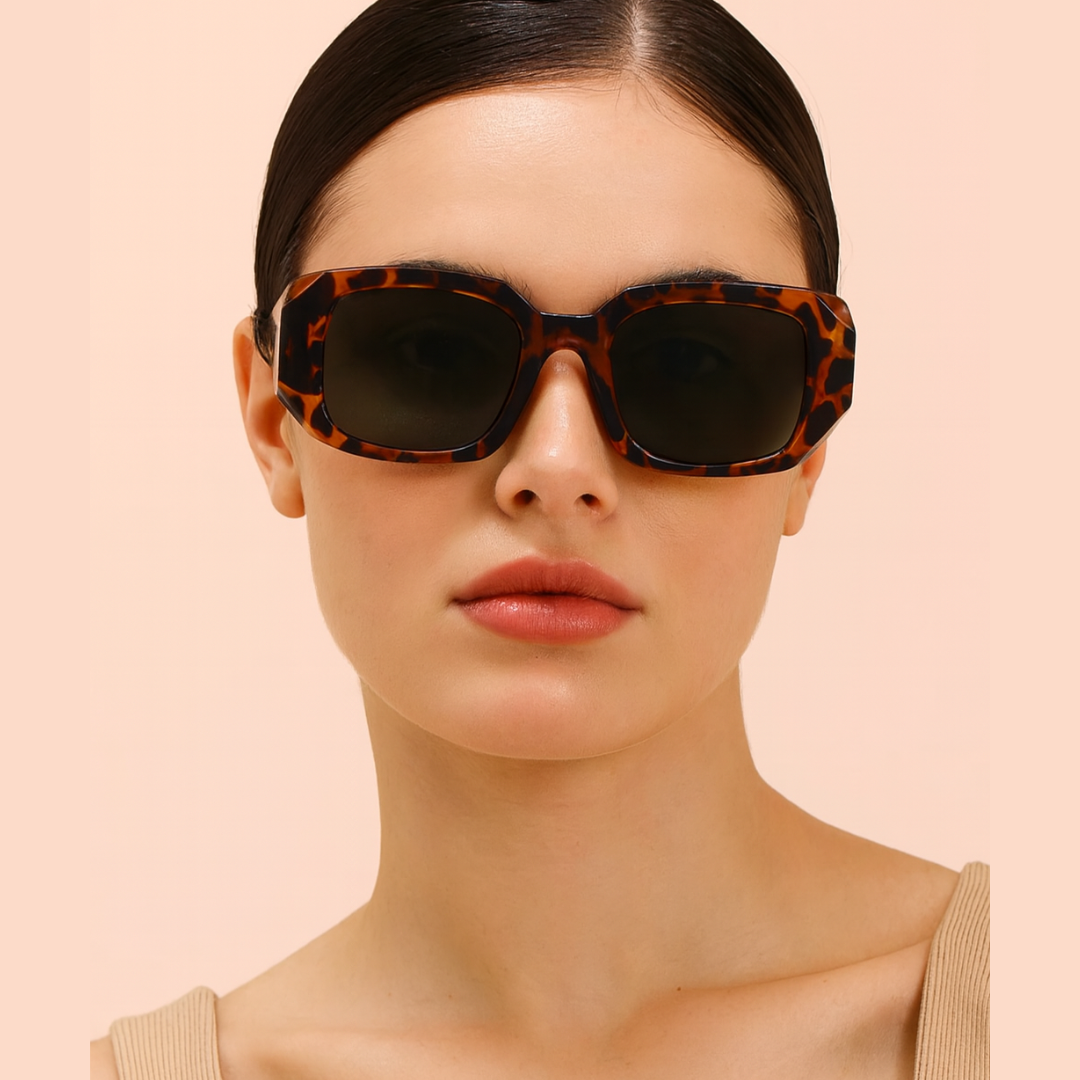 Bold beveled square frames with wide temples add instant polish to any look. Lightweight build with UV400 lenses keeps eyes comfortable in bright light.