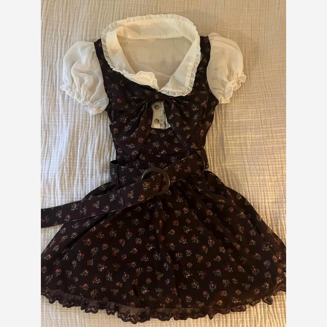 A sweet doll collar and airy puff sleeves create soft elegance, while the faux two-piece silhouette flatters your shape with effortless charm. Delicate floral prints complete this dreamy mini, inspiring you to embrace every moment like a fairy-tale daydream.