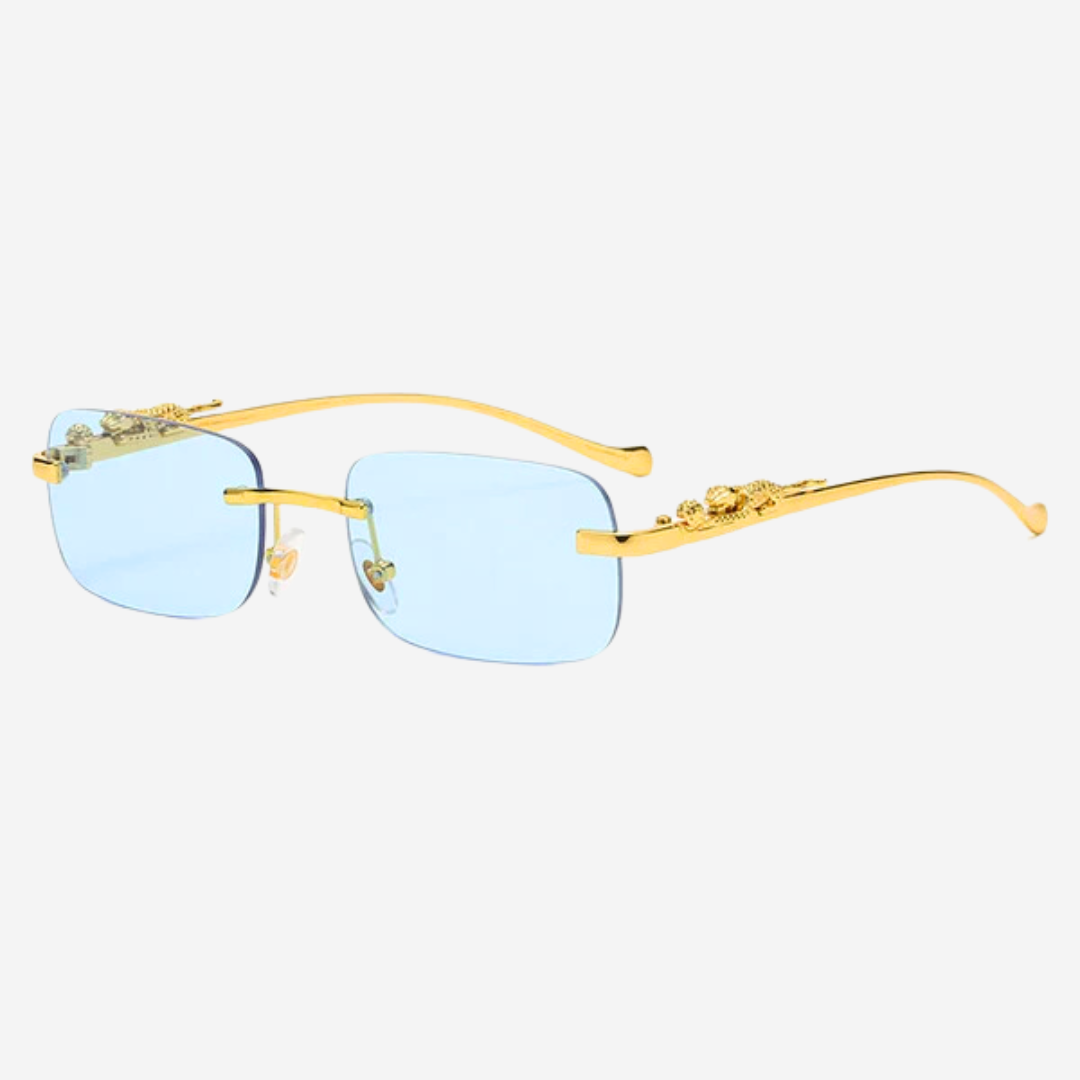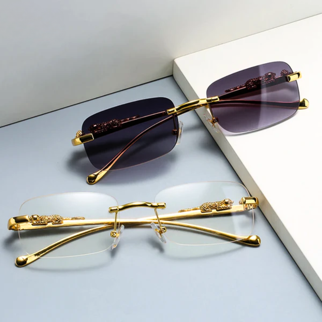 The rimless, hand-forged palladium frame vanishes, leaving behind a constellation of mesmerizing, handcrafted gold leopard sculptures adorning the temples. Deep, hand-blown crystal lenses, imbued with a subtle iridescence, shift and shimmer with every movement, reflecting your own captivating spirit.