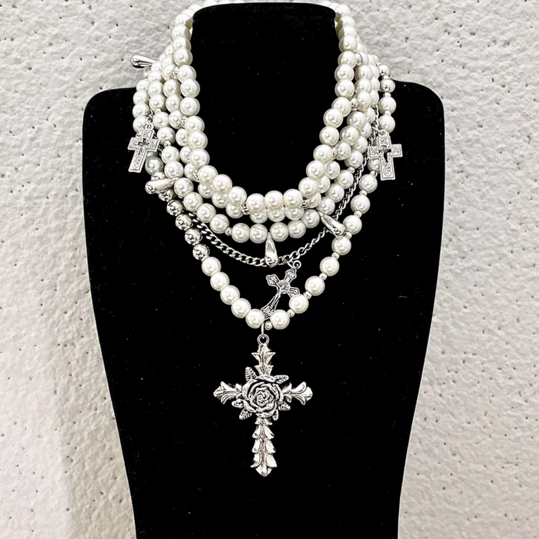 The Faith in Fervor Necklace isn't just jewelry, it's a radiant declaration. Layers of luminous pearls cascade to a breathtaking cross, shimmering with secrets of luxury and faith.