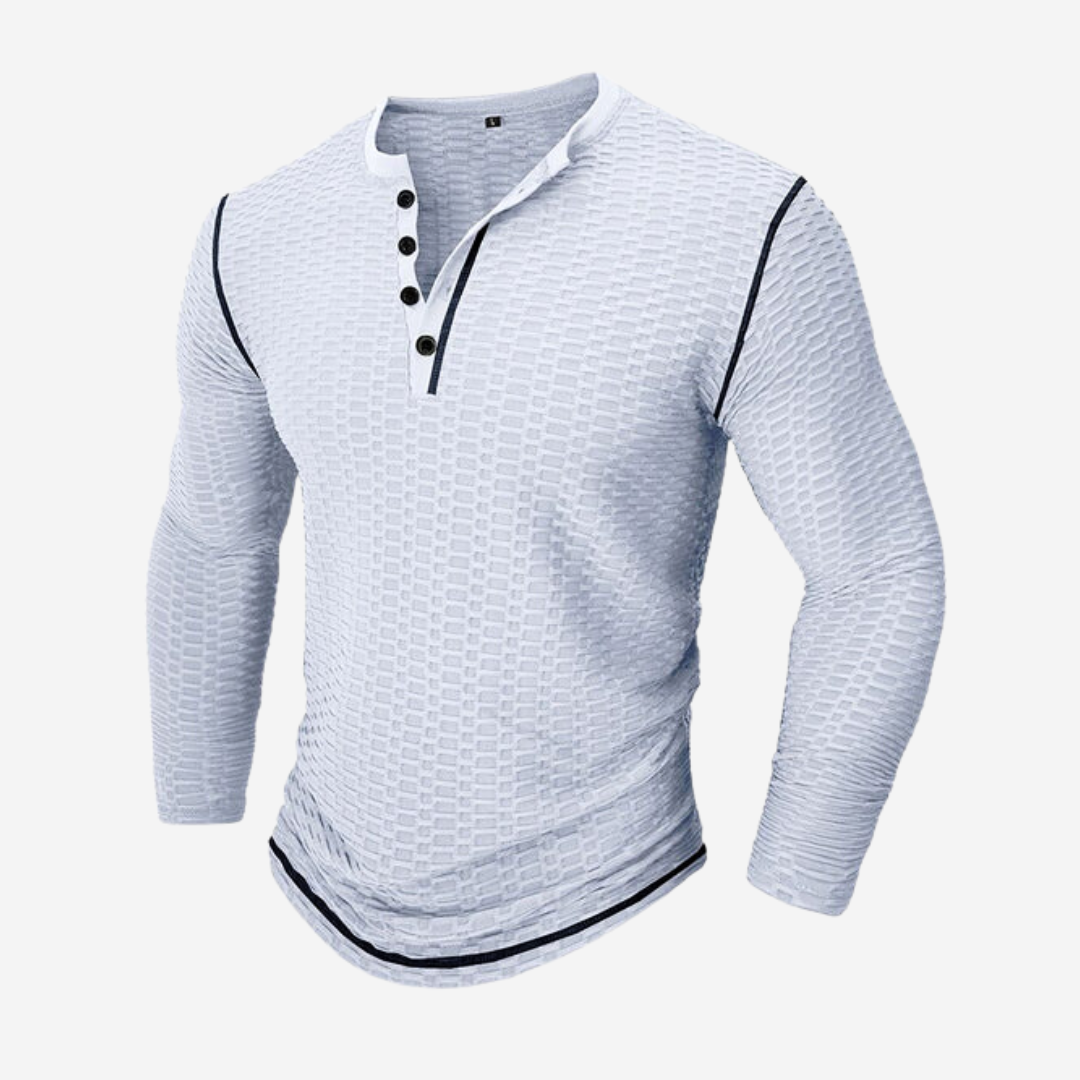 - Classic Henley neckline with a three-button placket