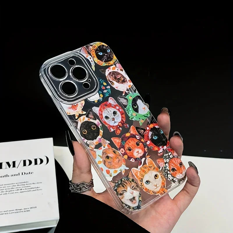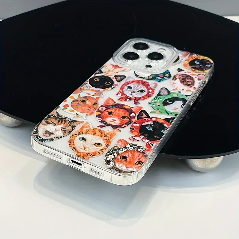 Feel the purr of sophistication with this refined cat-themed phone case, crafted from premium silicone that merges style and durability. A curated collage of colorful feline faces adorns its transparent frame, bringing both elegance and everyday protection to your iPhone.