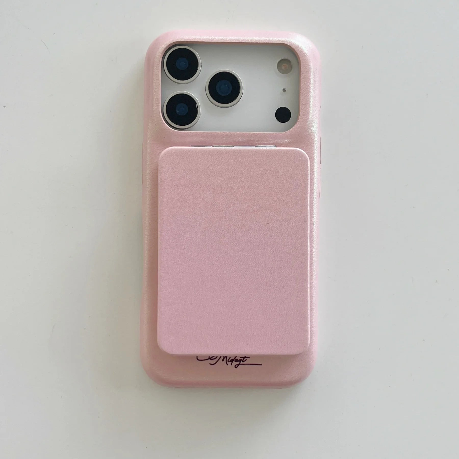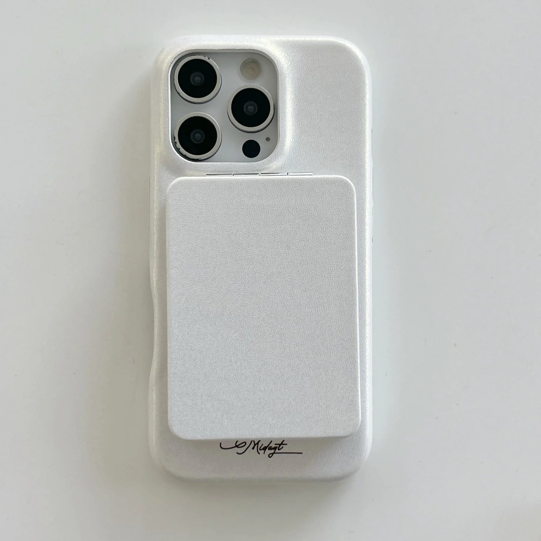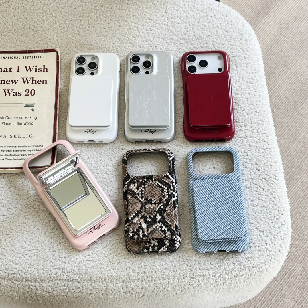 A sleek leather-texture case with a built-in flip mirror that doubles as a stand. Minimal outside, functional inside — and reinforced for real protection.