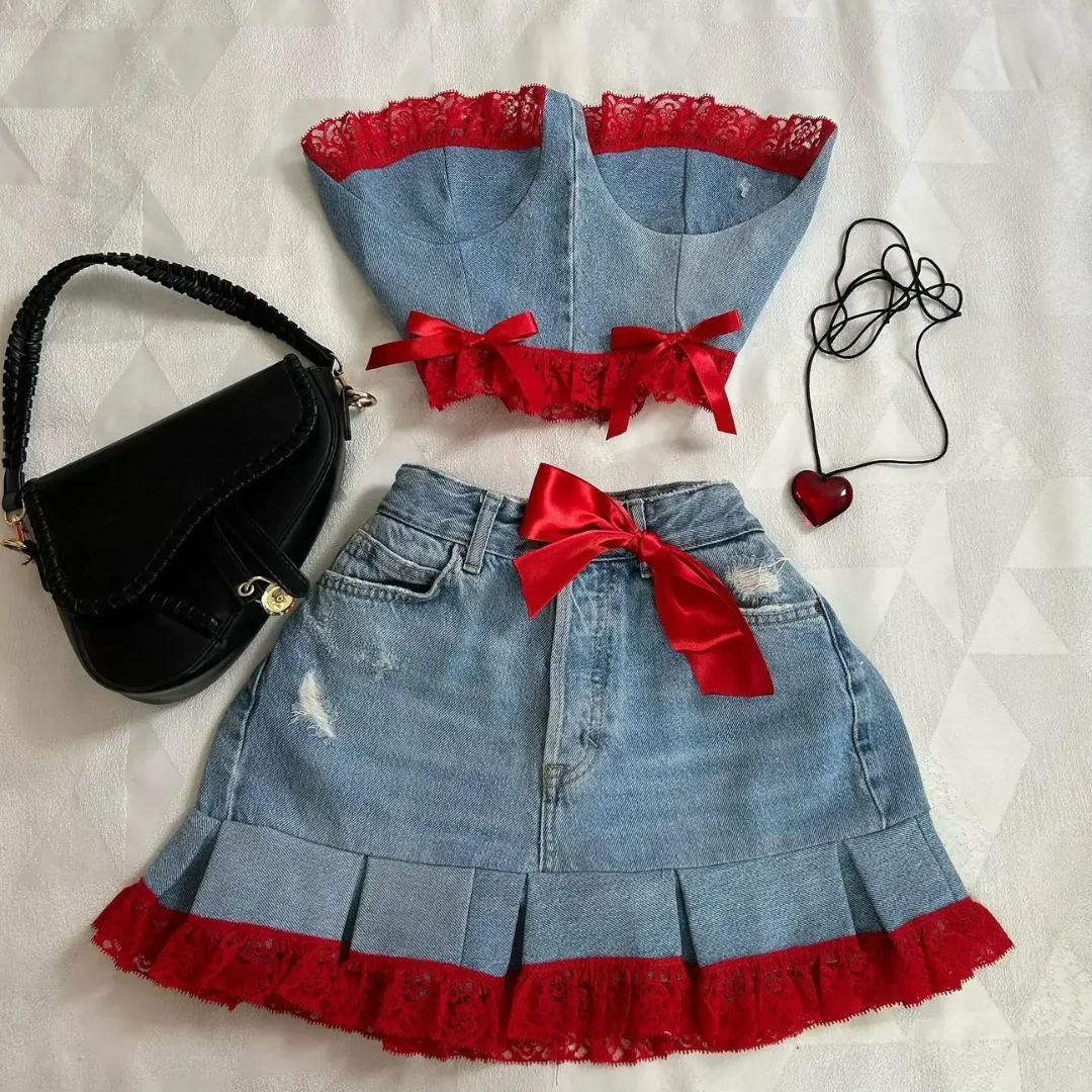 This playful two-piece ensemble is a burst of vibrant style, featuring a denim crop top and pleated mini skirt, both accented with eye-catching red ruffles and a bold red belt. It's the perfect outfit for those who love to make a statement.