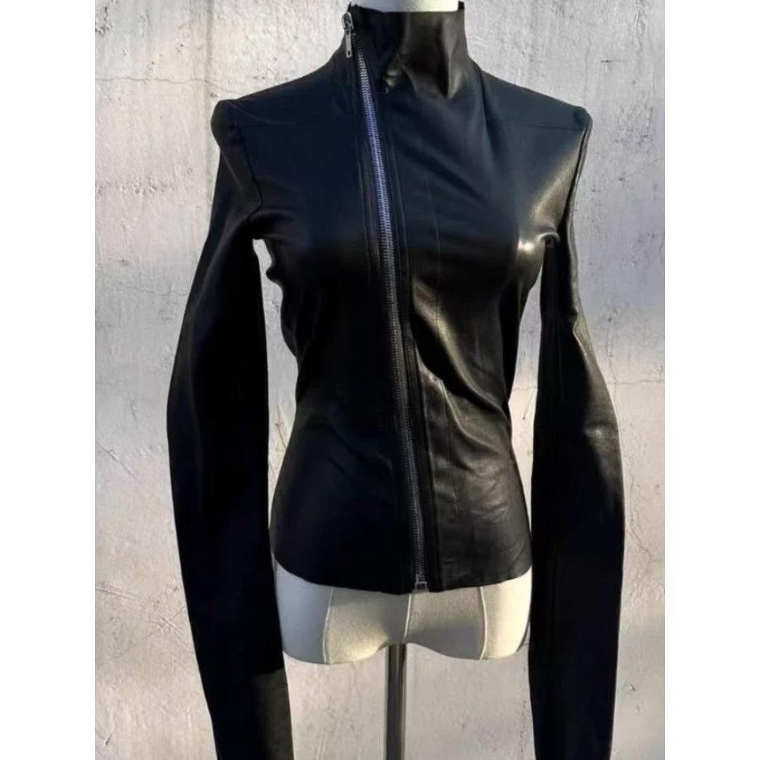 This ultra-fitted faux leather jacket zips high at the neck and skims the waist, creating a sharp hourglass shape that feels very night-out, very “main character.” Smooth, slightly glossy fabric and long, sculpted sleeves give it that dark, editorial look that photographs insanely well in flash and street shots.