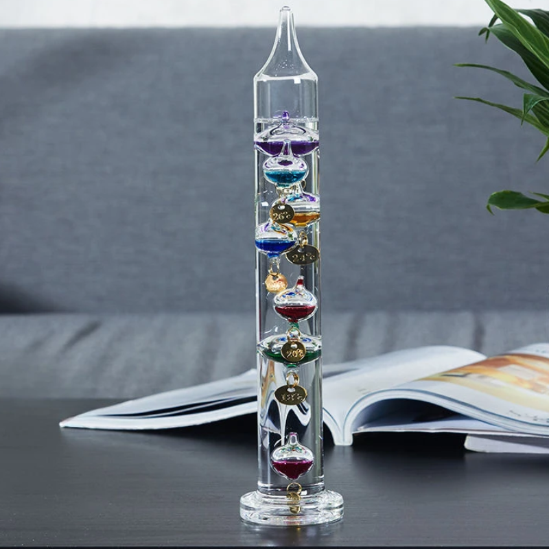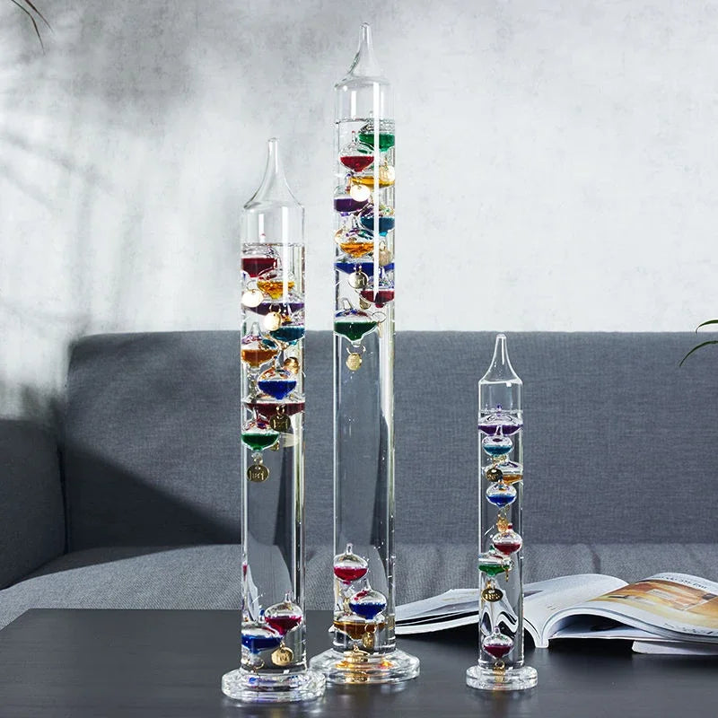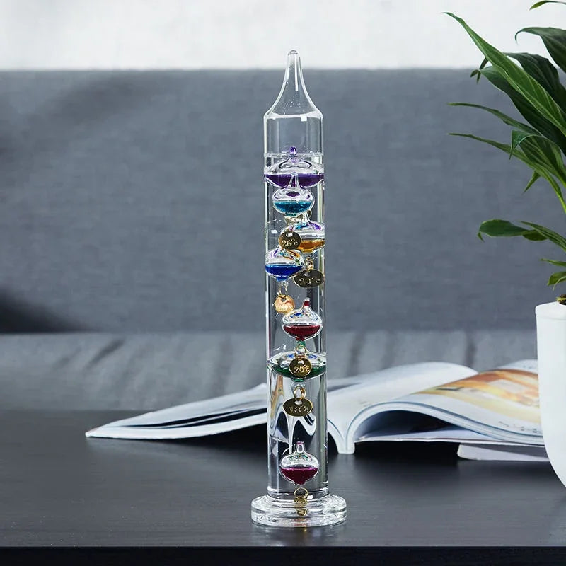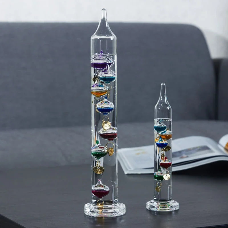 Encased in a sleek glass cylinder, the Galileo Elegance features a collection of precision-crafted glass vessels, each filled with a distinctive colored liquid. As the ambient temperature shifts, the varying densities cause the vessels to rise and fall, revealing the current temperature with elegant simplicity.