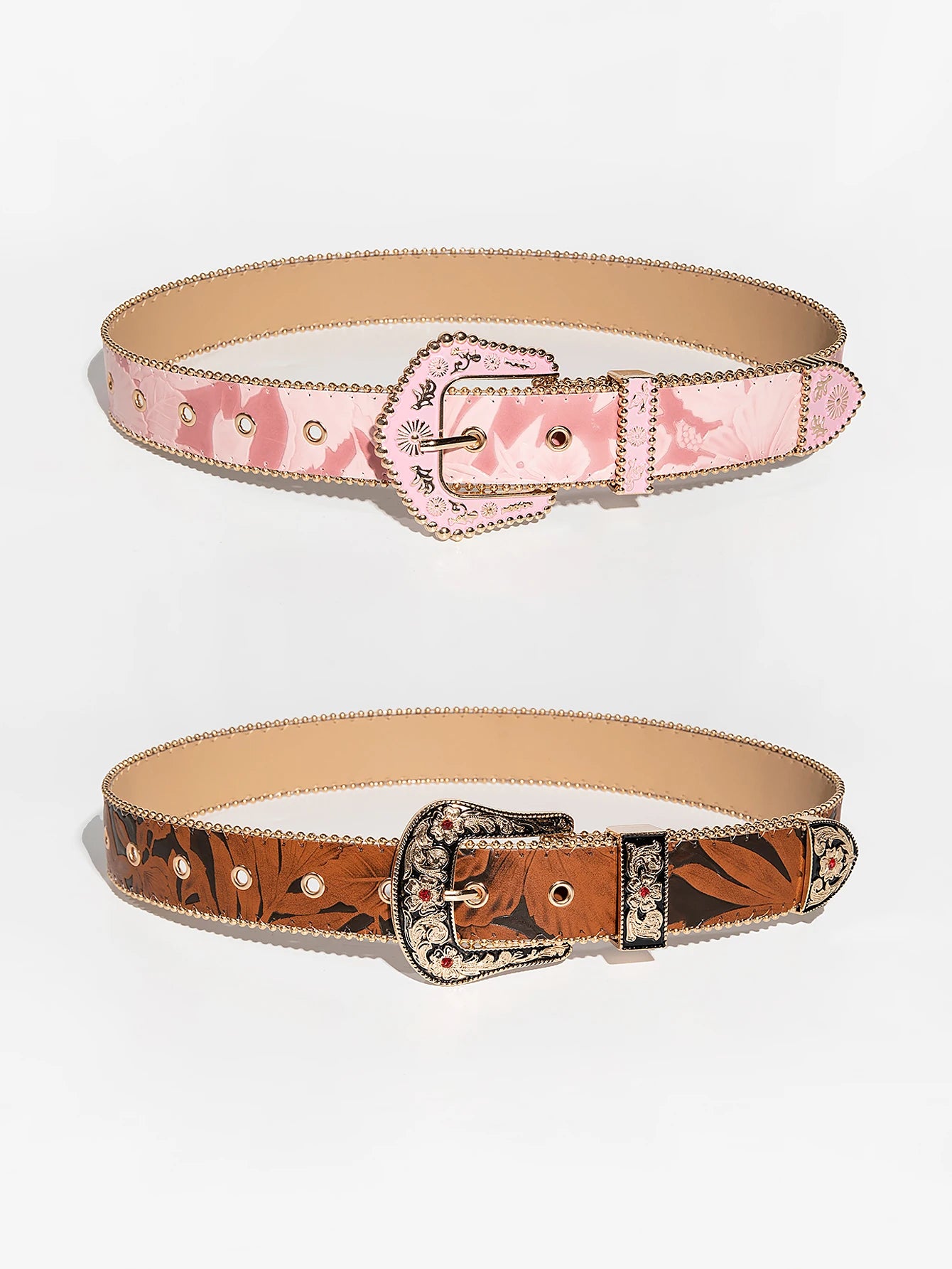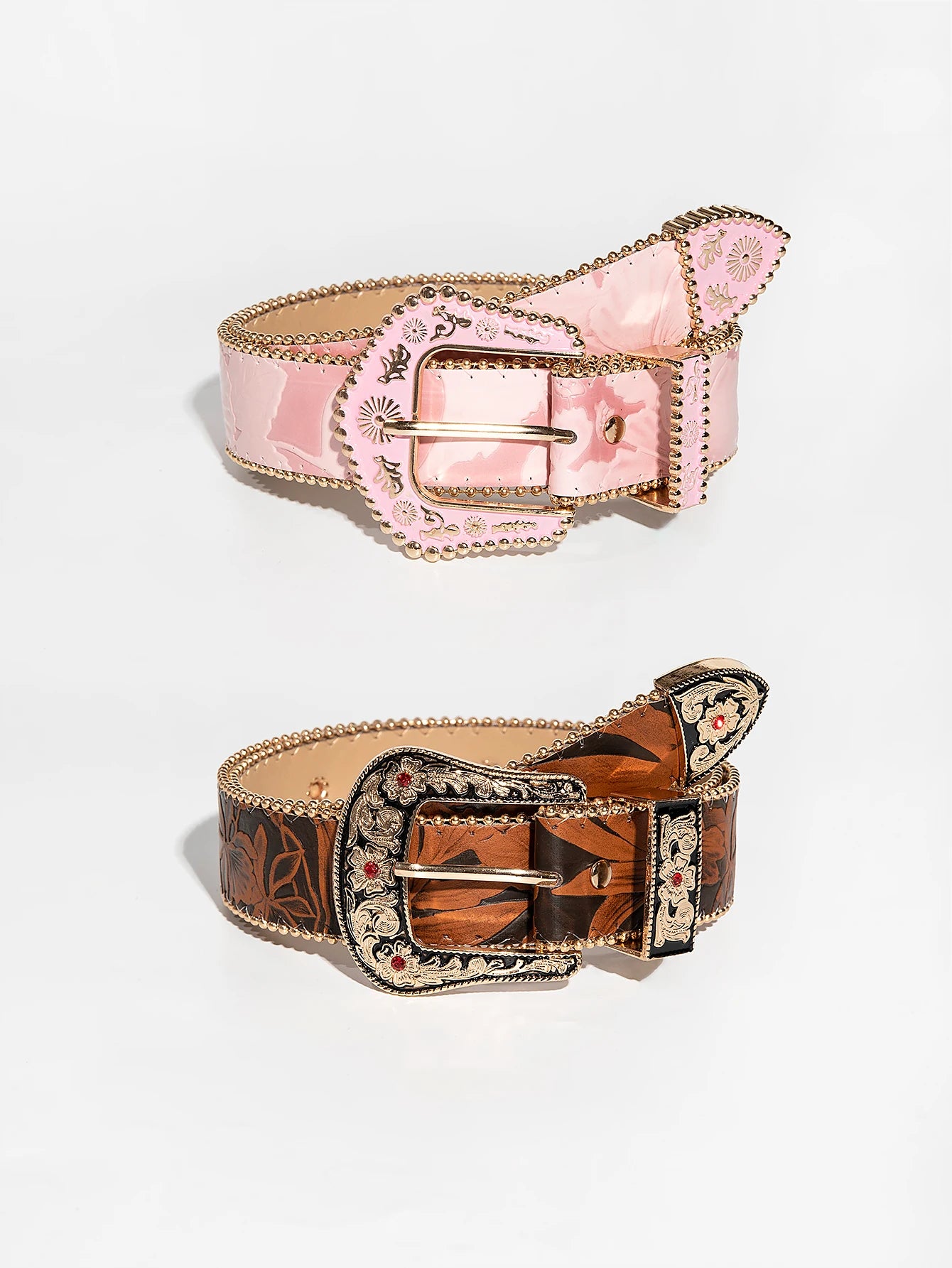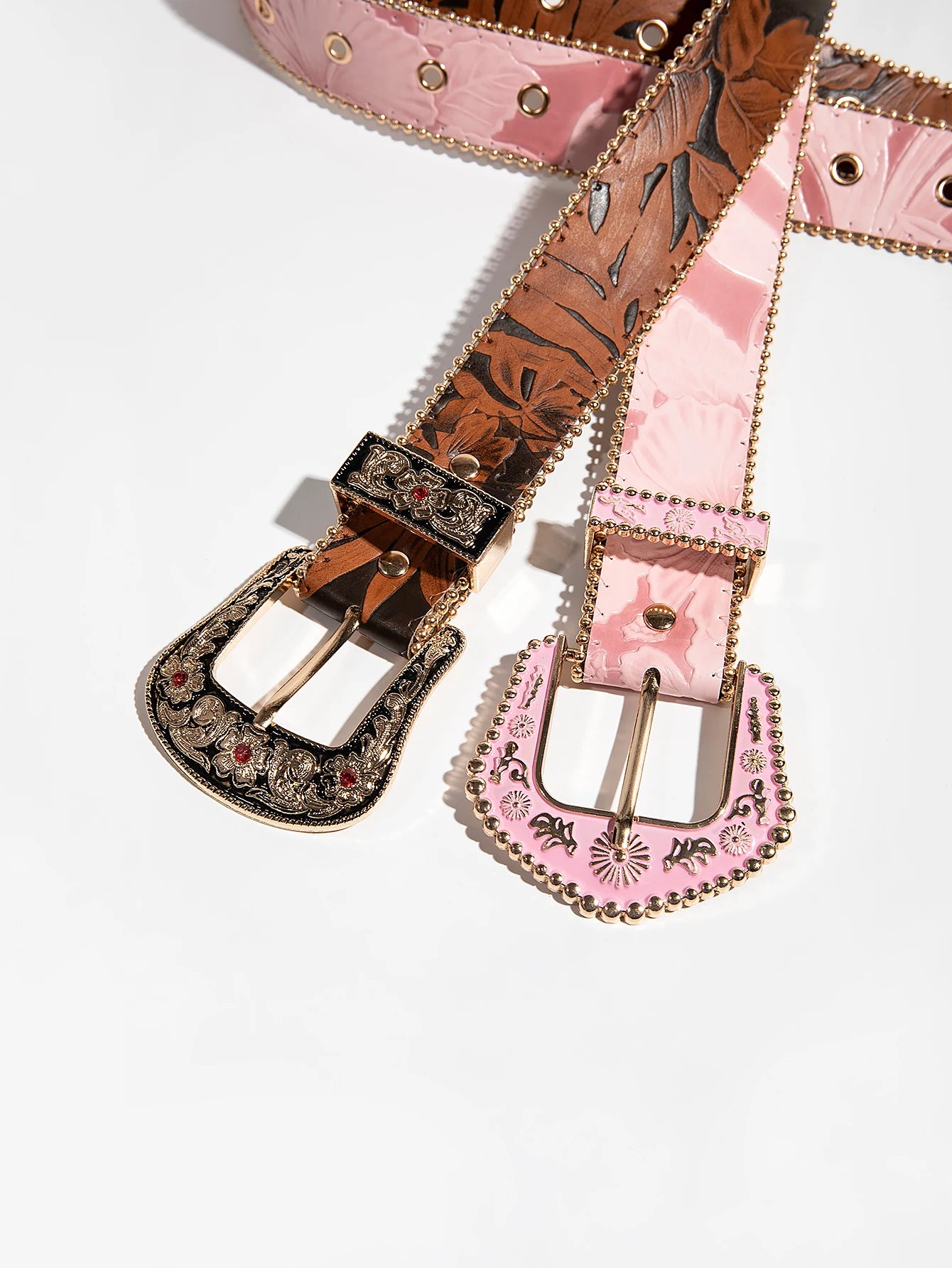 This exquisite belt is crafted with a vintage-inspired design, featuring a beautifully carved buckle adorned with shimmering gems and a delicate floral embossing.