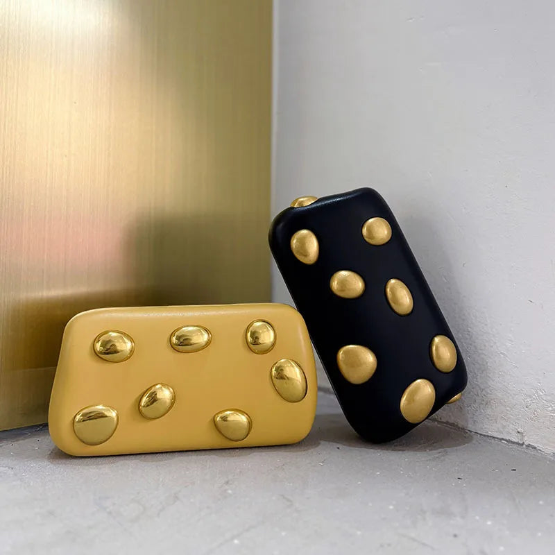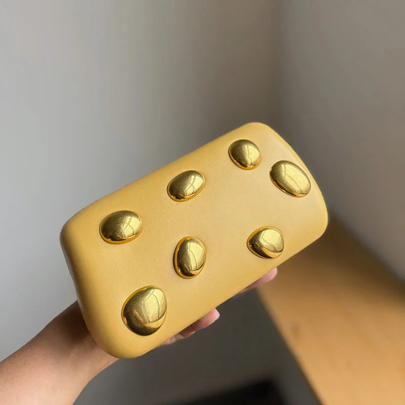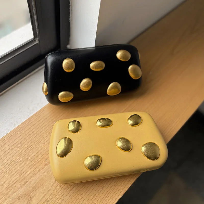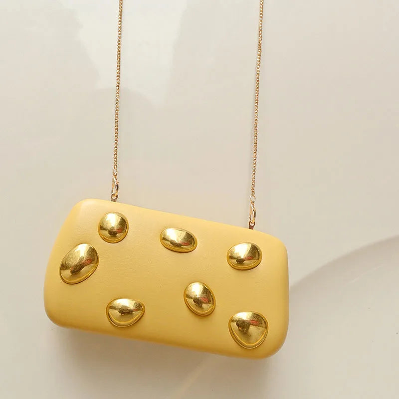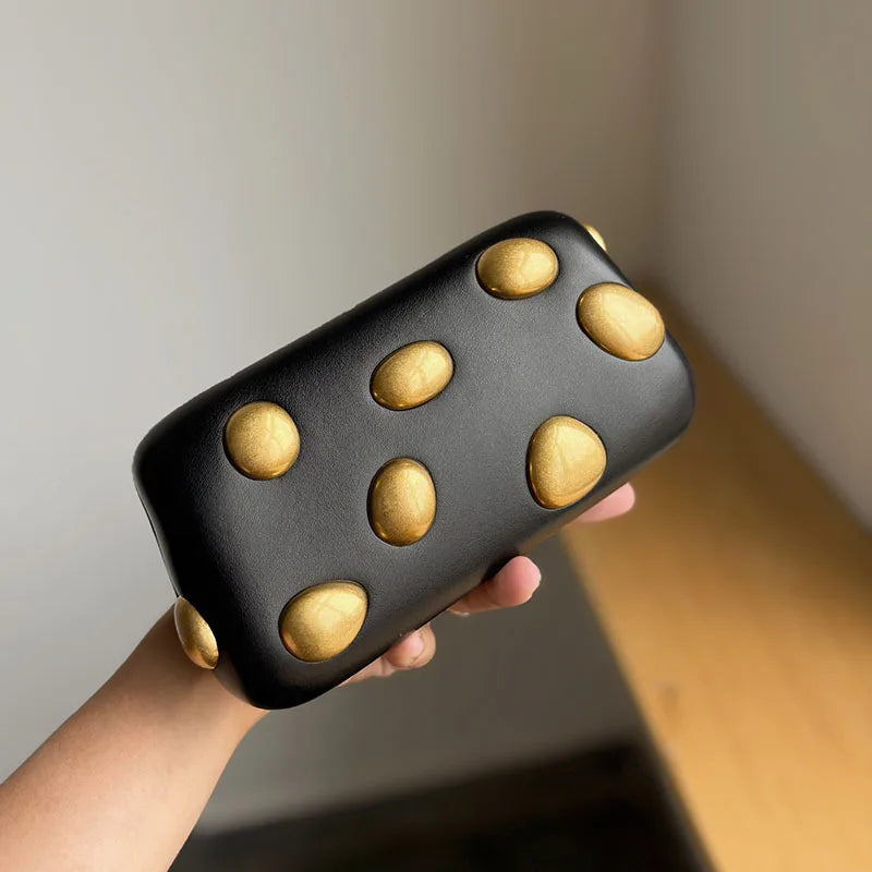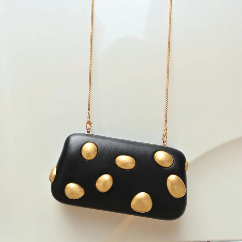 Metallic gold pebble studs stand out against a sleek leather-textured shell, giving the clutch a bold, sculptural look that instantly elevates any evening outfit. The compact size fits essentials while the gold-tone chain strap adds a touch of luxury for parties, weddings, and night outings.