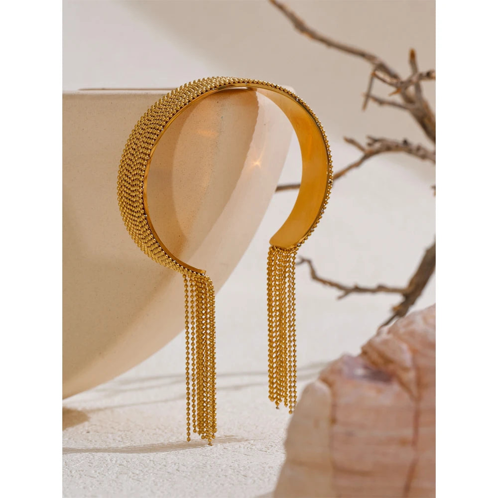 This stunning bracelet is crafted from gold-plated stainless steel and features a mesmerizing tassel that dances with every move. Its adjustable design and luxurious finish make it the perfect accessory to elevate your everyday style.