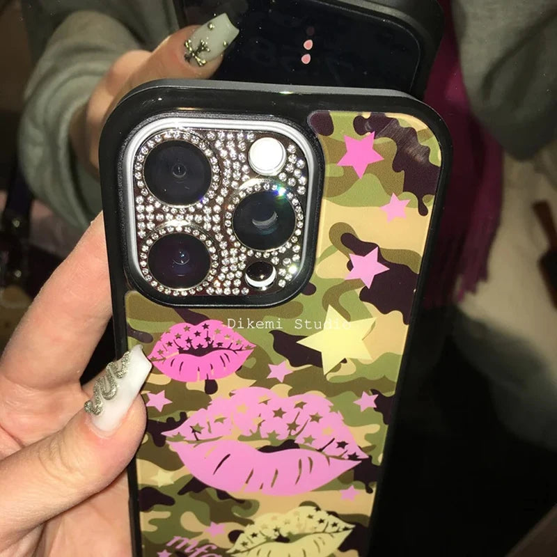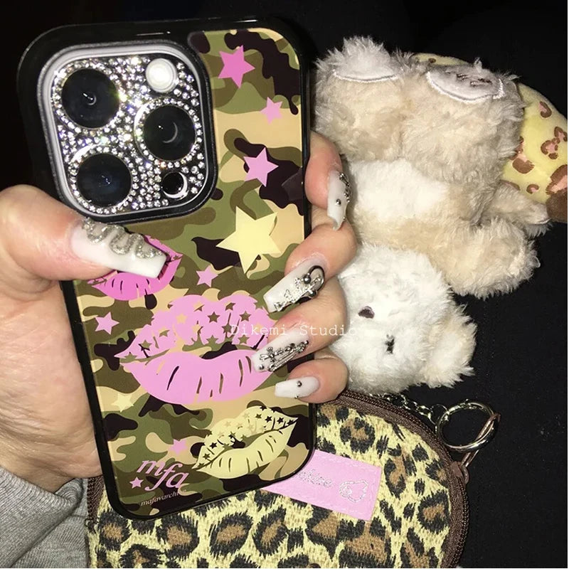 Jungle‑green camo collides with pop‑pink lips and neon star bursts, giving your phone the energy of a backstage pass at a 2003 runway after‑party while a slim shock shell keeps everything battle‑ready.