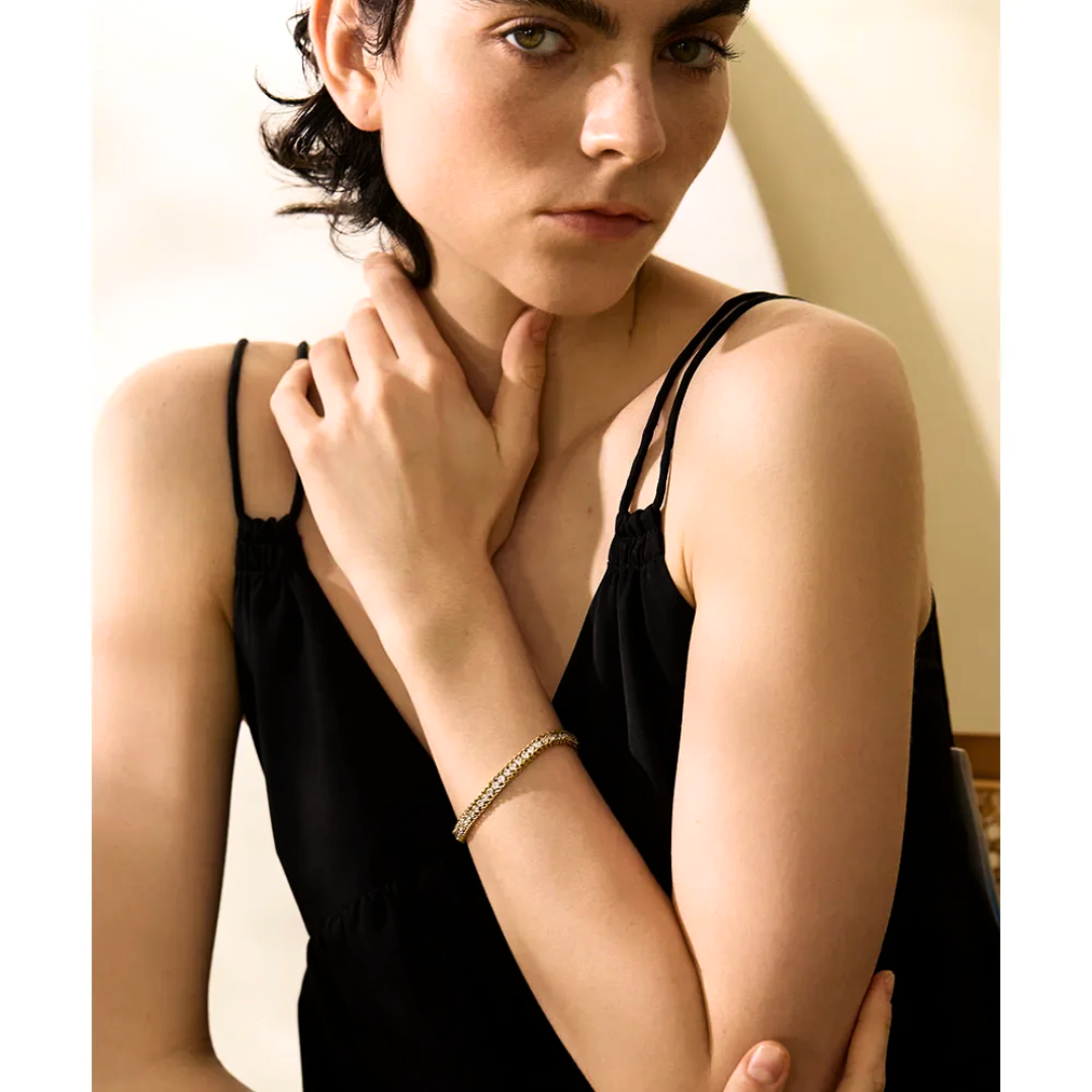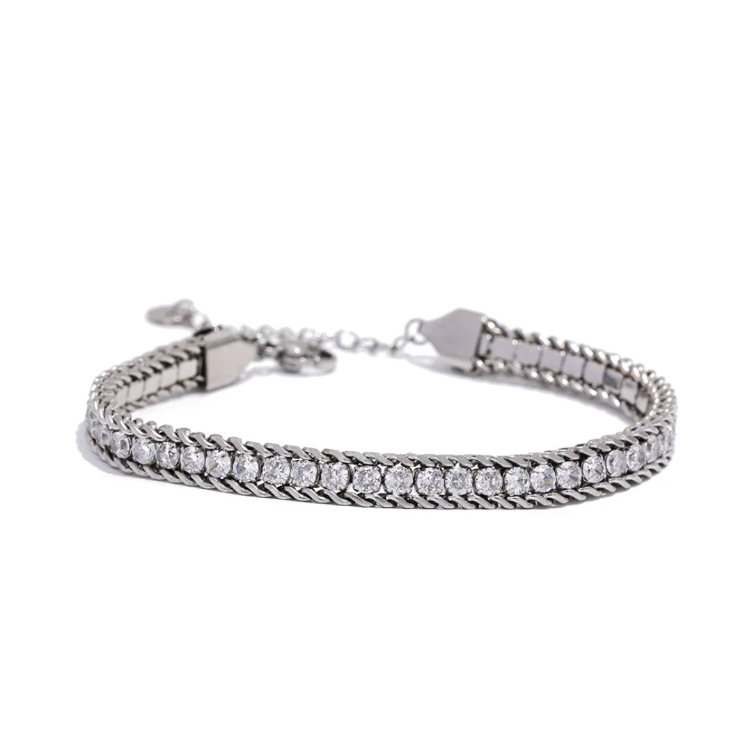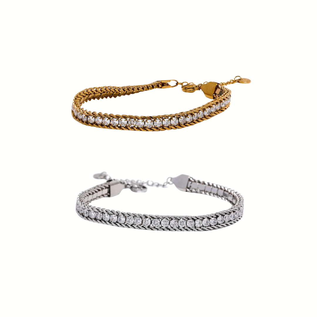 This stunning piece features a gold-colored stainless steel chain adorned with shimmering cubic zirconia stones, creating a look that's both timeless and trendy. Crafted with waterproof materials, this bracelet is designed for the modern woman who wants to shine, no matter the occasion.