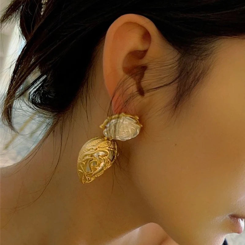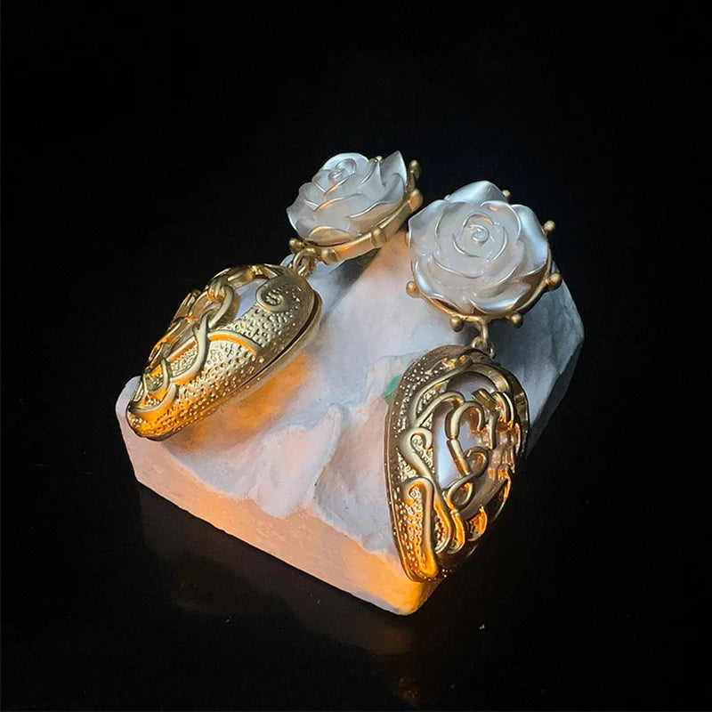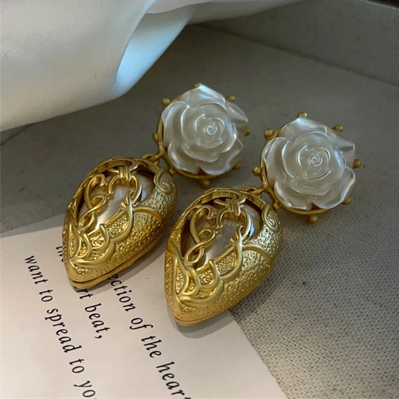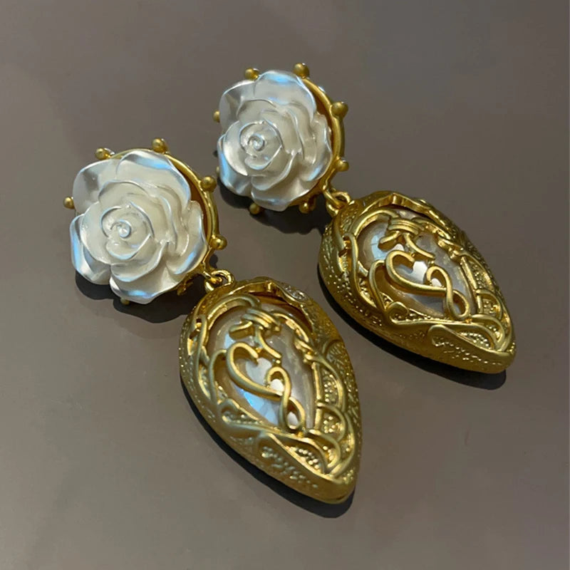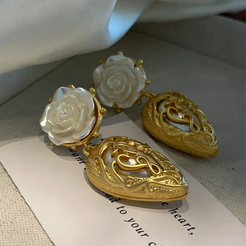 These vintage-inspired earrings are crafted with intricate detail, featuring a delicate arrangement of gold-tone leaves, a blossoming white rose, and a luminous pearl accent. Designed to make a statement, these earrings are the perfect finishing touch for any special occasion ensemble.