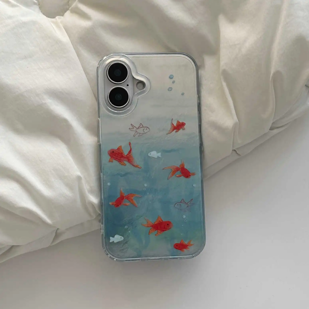 A double‑layer clear shell drifts from mist to lagoon blue, scattered with hand‑inked scarlet goldfish that seem to swim under the glass every time the light shifts.