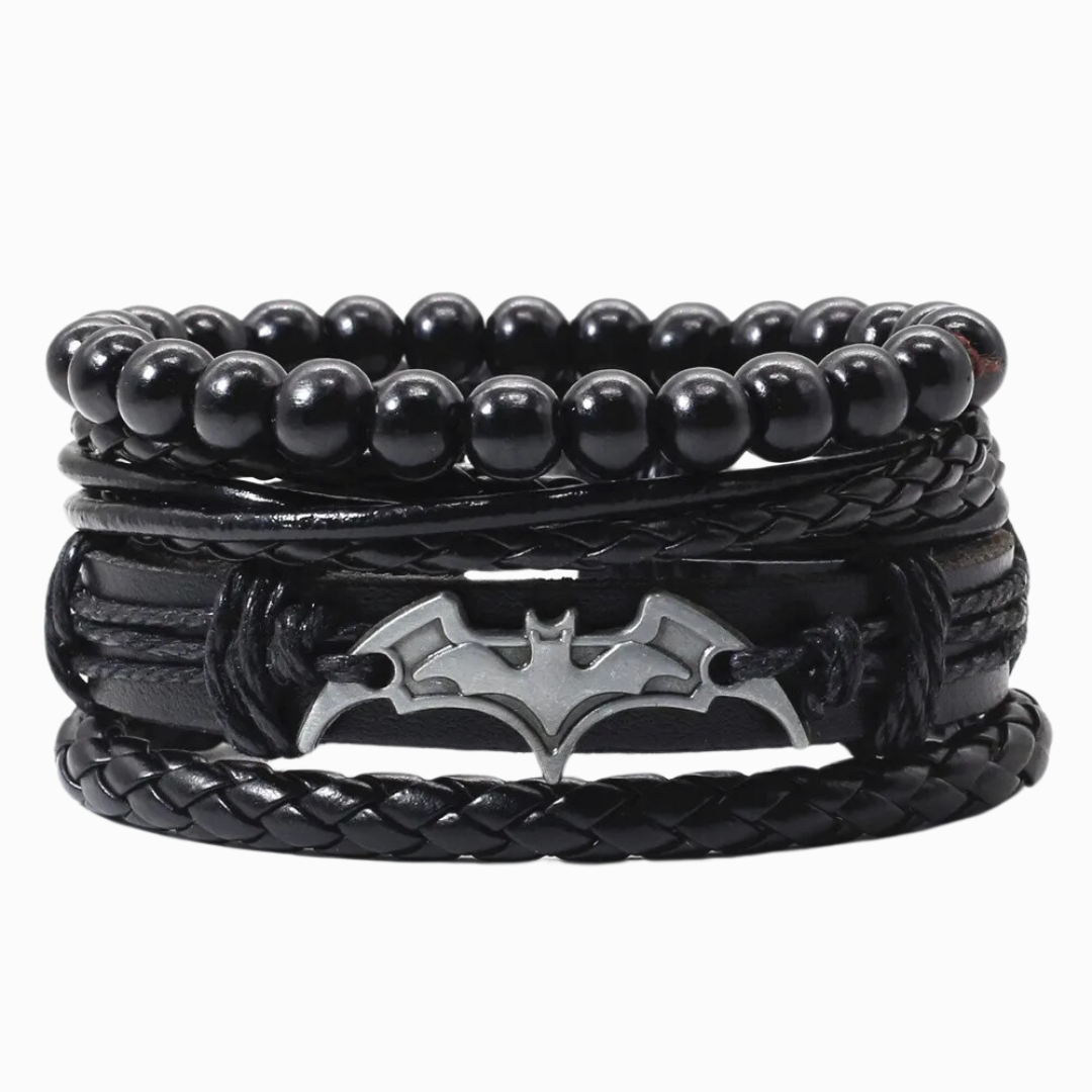 Embrace your inner hero with The Gotham Guardian Bracelet, a bold and stylish accessory that celebrates the iconic Batman. This striking bracelet features a stack of black beads and various styles of black leather bands, all unified by a striking metallic Batman logo charm in the center.