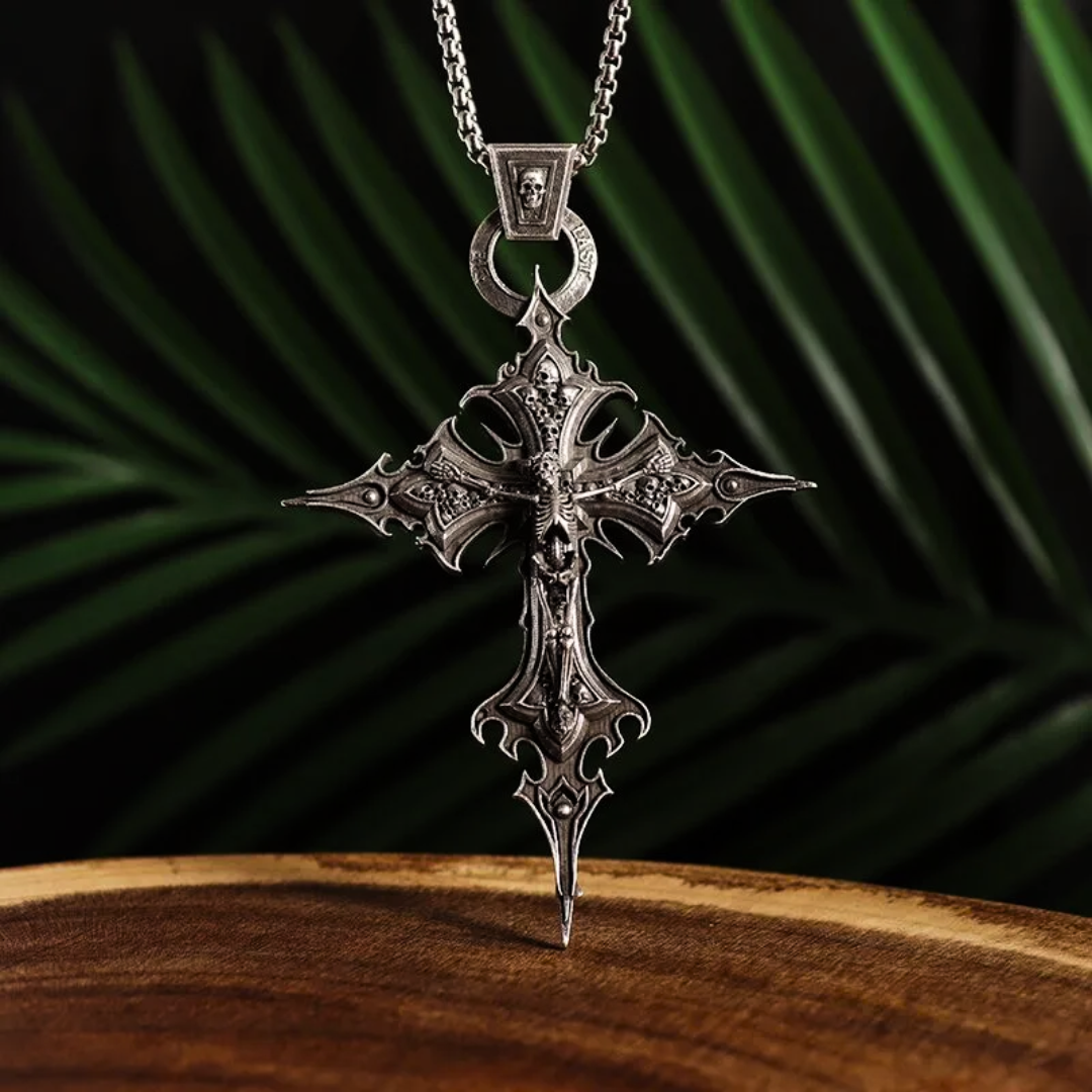 This intricately crafted piece features an ornate cross design with elaborate filigree patterns, evoking the mystique and allure of the gothic era. A captivating accessory for those who dare to embrace the shadows.