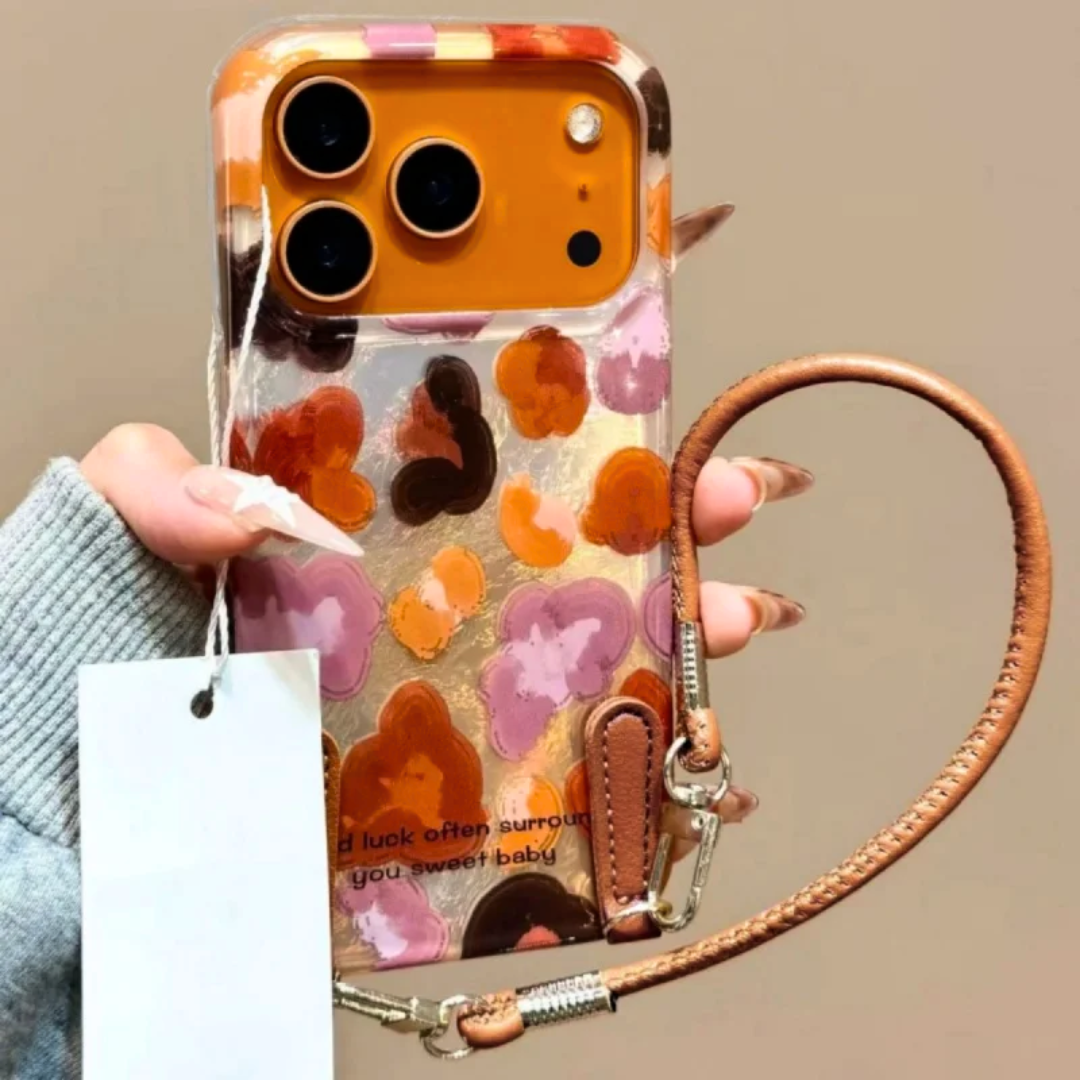A bold graffiti-style leopard pattern layered over a glossy shell for instant contrast and attitude. Finished with a wrist strap and built for daily protection.