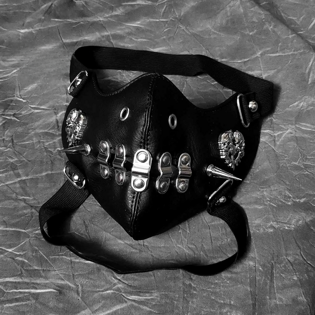Built for spotlight moments—not safety gear. This black faux‑leather mask loads on skull badges, rivets and spikes, with adjustable straps for a secure, dramatic fit at concerts, cosplay, and shoots.