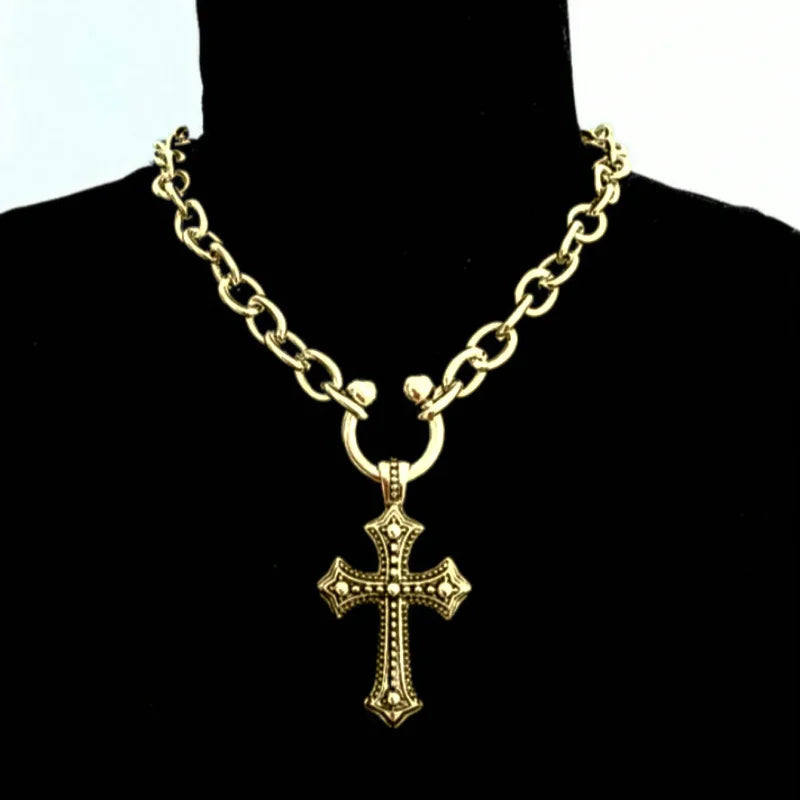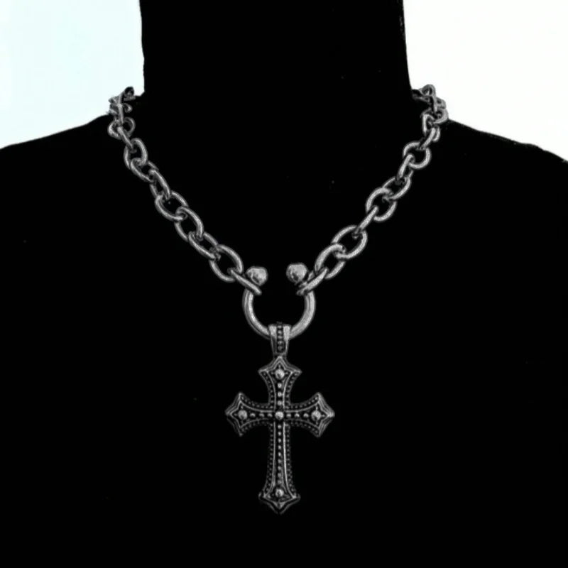 A substantial curb chain anchors a vintage‑style cross pendant with bead‑detailed arms—bold, weighty, and designed to layer. Finished with a secure clasp, it sits at the collar for maximum impact.