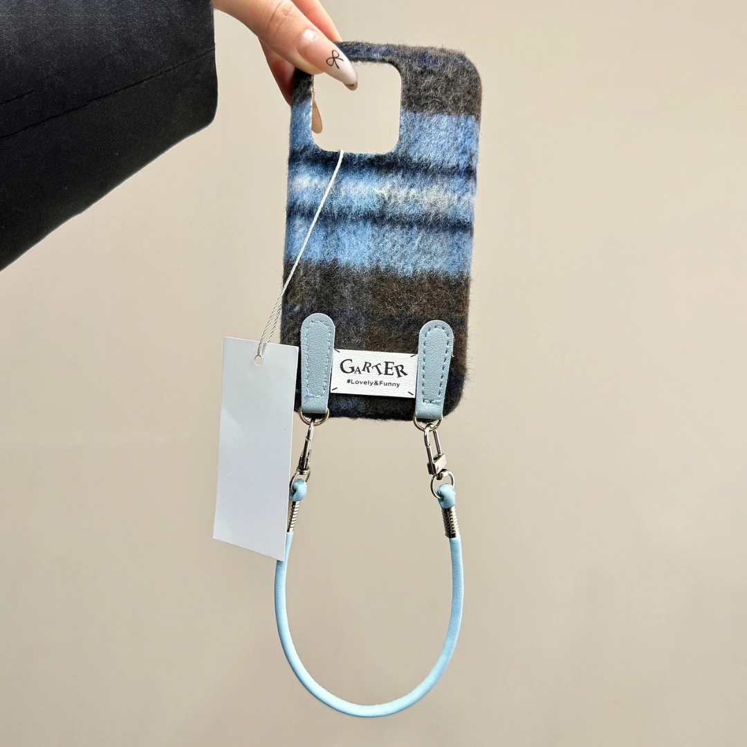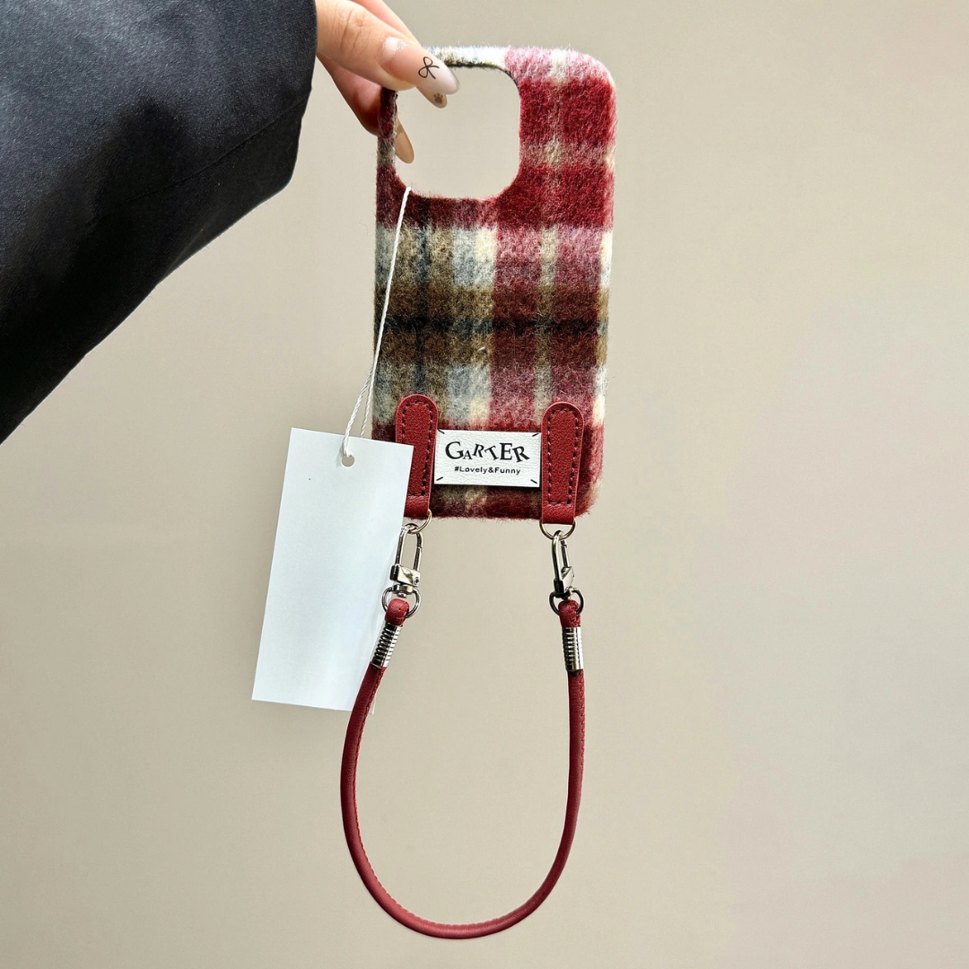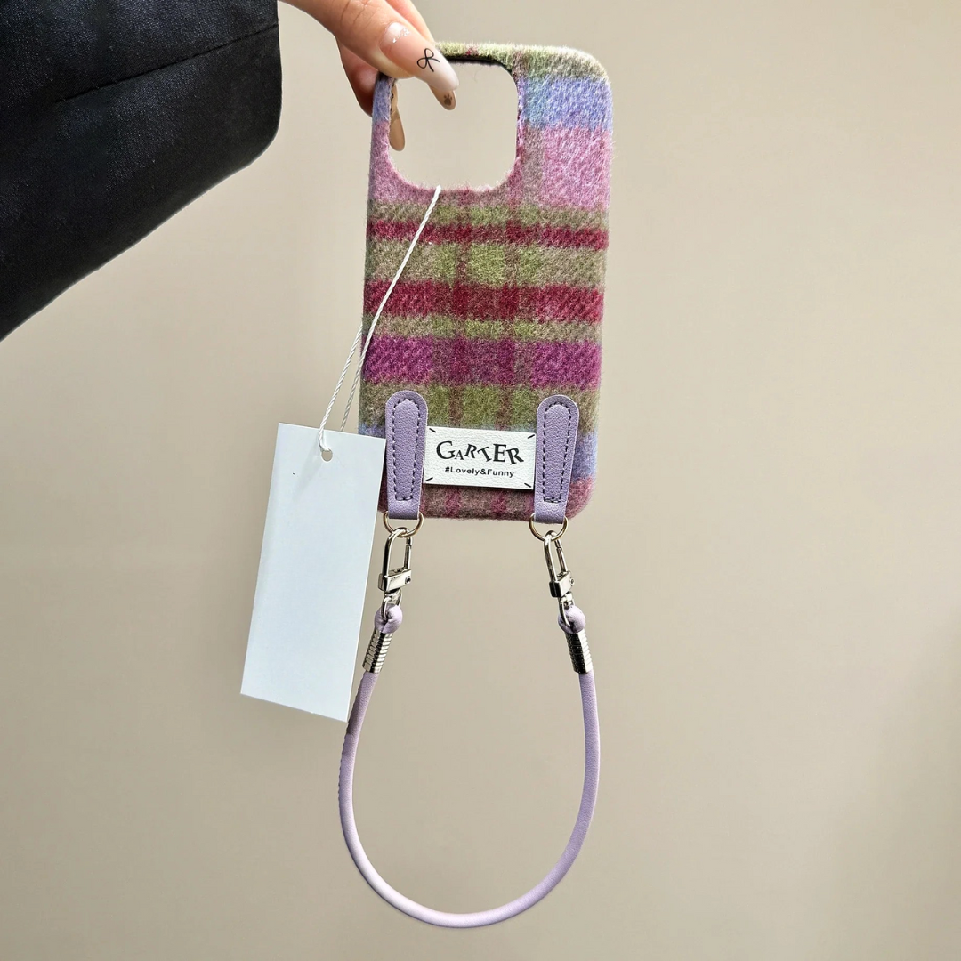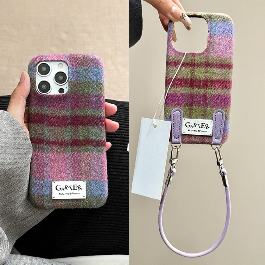 A cozy plaid back meets a removable lanyard so your phone wears like a mini sling—snug in the hand, easy on the go. The fuzzy finish feels like winter wool while corners stay clean and structured.