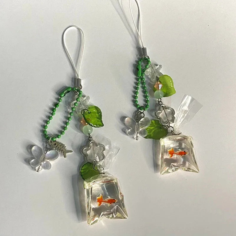 Bring a dreamy, undersea charm to your everyday style with the Little Koi Oasis Keychain. Each miniature fish is lovingly crafted to float in a crystal-clear bag for a lifelike aquatic effect. Soft green beads and subtle floral accents complete the design, adding a whimsical touch that pairs perfectly with any bag, phone, or key set.
