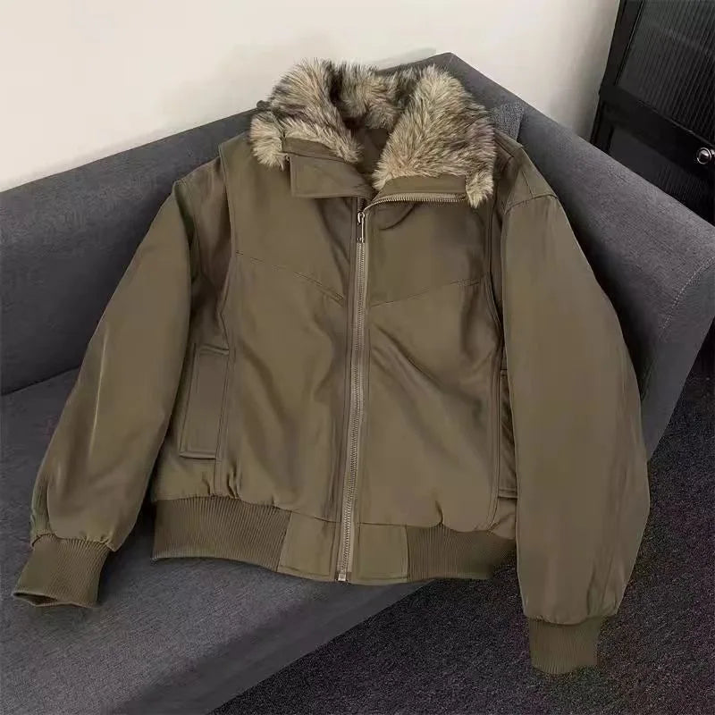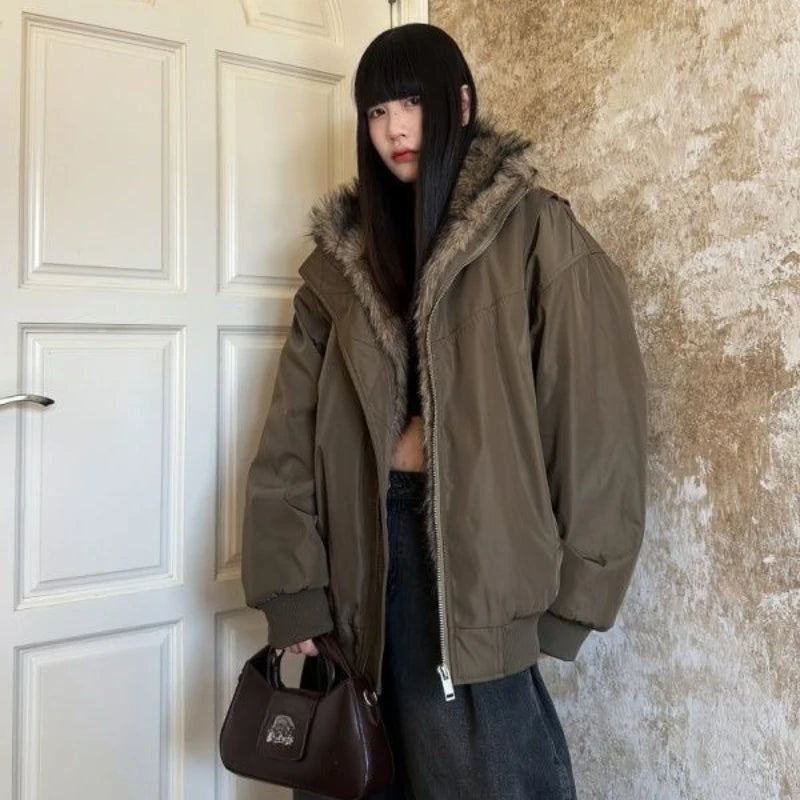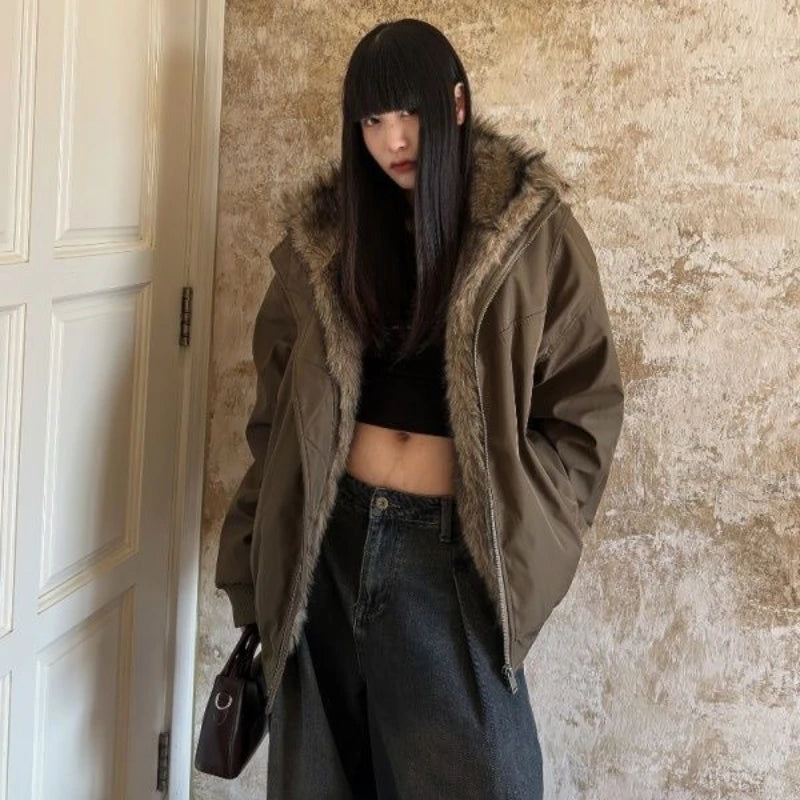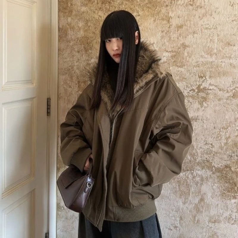 - Woven shell with plush faux‑fur‑trimmed hood, cozy lining